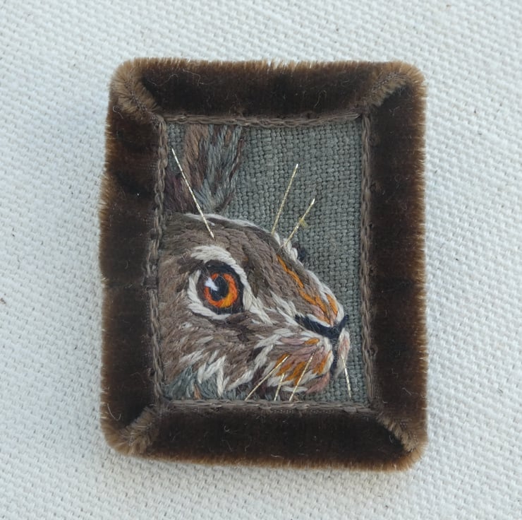 This little Hare was embroidered by hand onto fabric pieces in shades of brown and cream, and then edged with a soft velvet ribbon, which gives the item structure and a luxurious feel. The details are picked out with individual strands of embroidery thread and the whiskers are gold thread. The Hare's watchful amber eye has a glint of mischief...