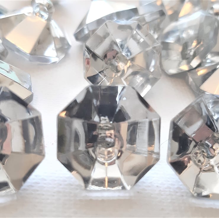 17mm diameter buttons, resembling diamond gemstones, octagon shaped with a back shank (loop). Lovely and glamorous! Plastic. New. Pack of 10.