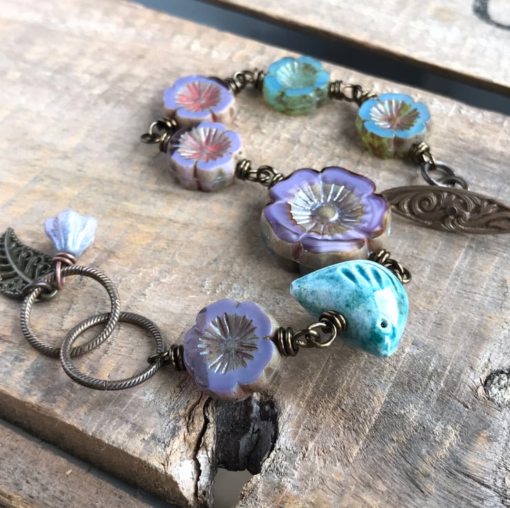 At the end of the bracelet, a small Czech glass bell flower and a bronze filigree leaf charm dangle, adding the perfect finishing touch.