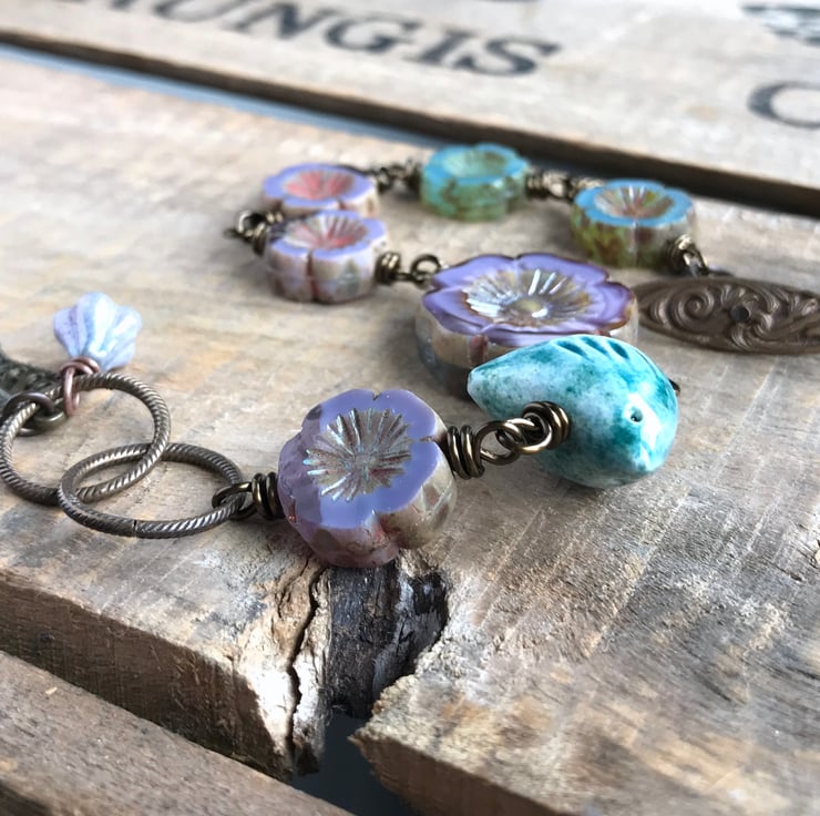 Surrounding the bird are Czech glass table-cut flower beads in soft seafoam and lavender shades. Each flower has a rustic Picasso finish along the edges and are carefully wire-wrapped together one by one.