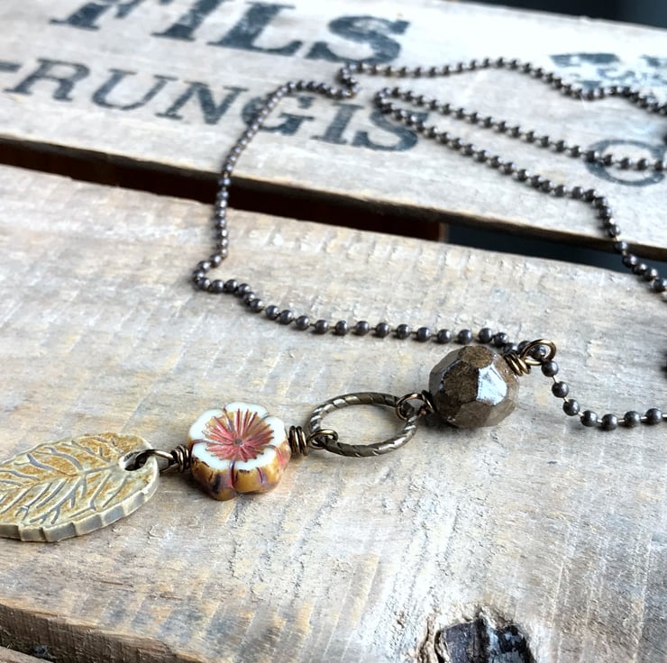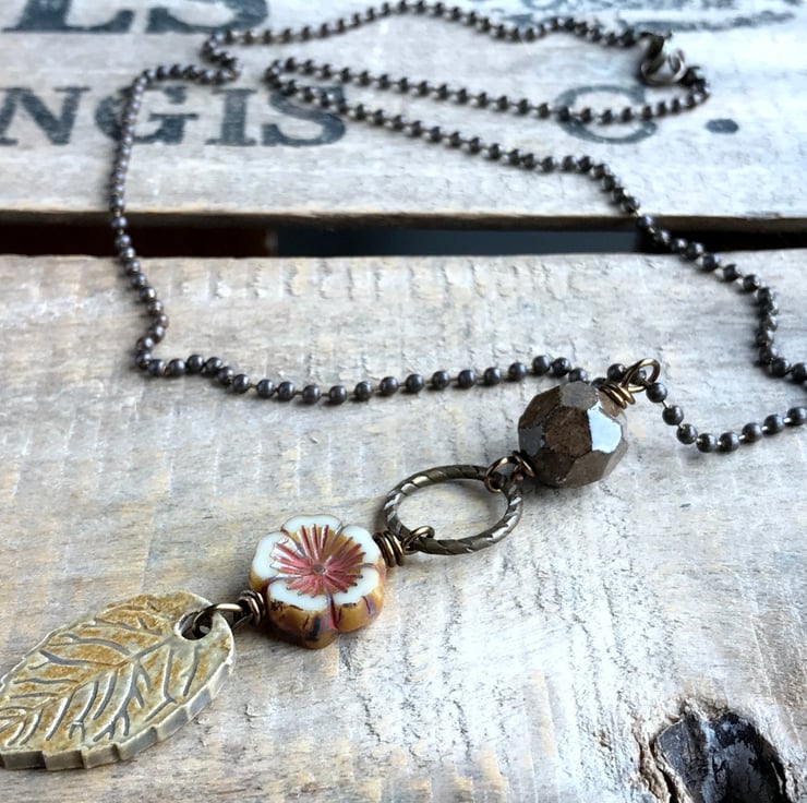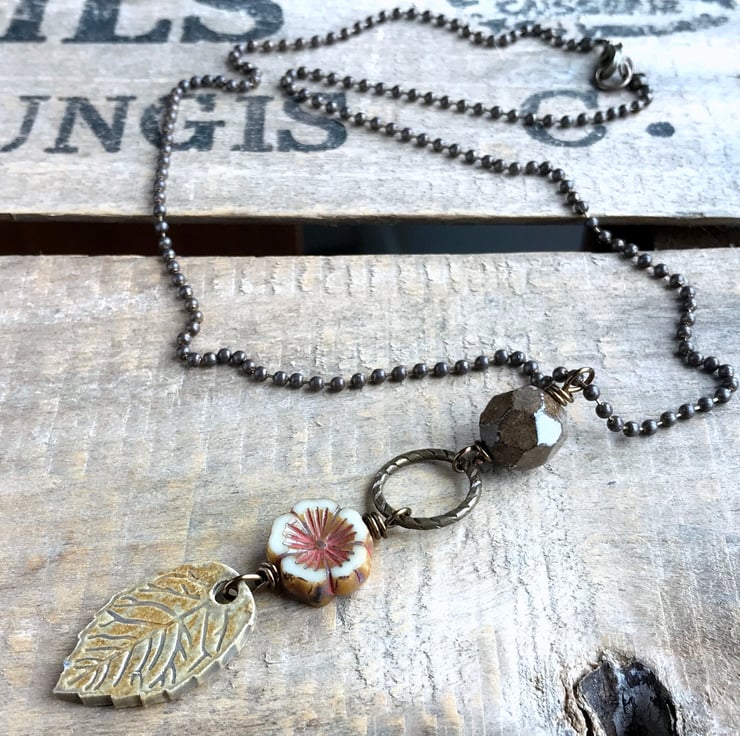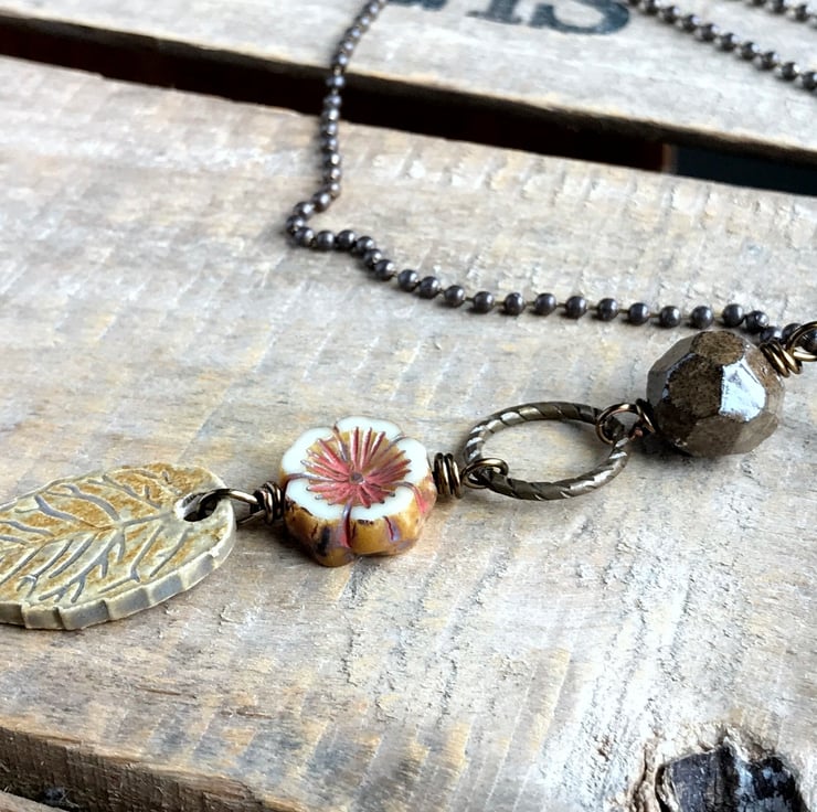 Nature inspired necklace featuring a rustic mix of Artisan ceramics, Czech glass and antiqued brass.