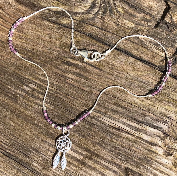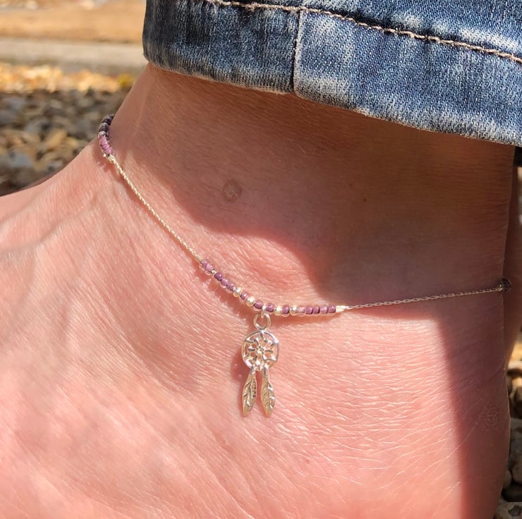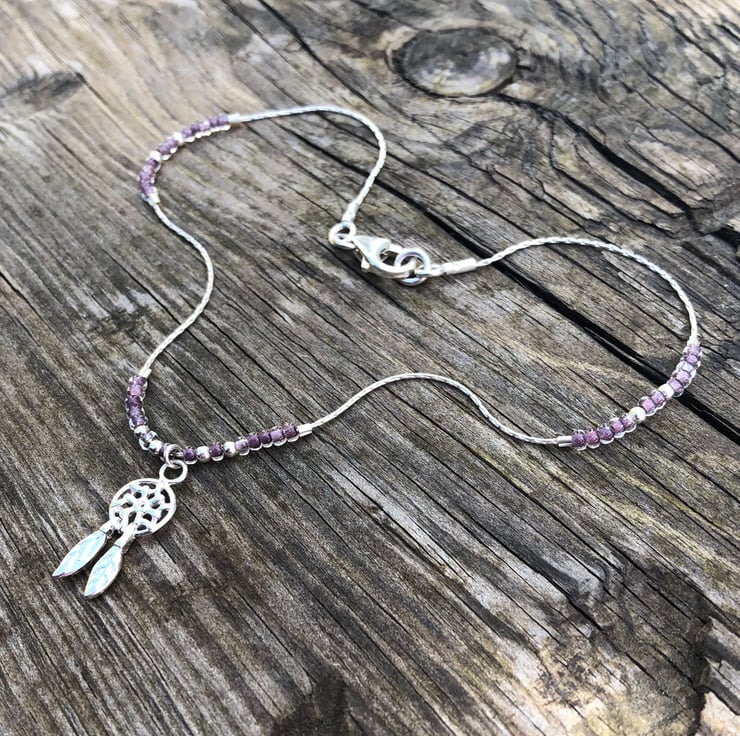 Dream catcher & purple seed bead floating anklet. Sterling silver.