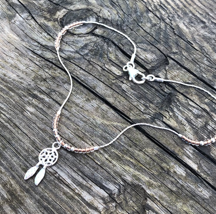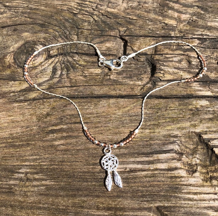 Made using sterling silver beading chain which is .7mm thick. To this I have added Czech glass seed beads and 3mm sterling silver beads. These are fixed into place using sterling silver crimp beads. The anklet fastens by a sterling silver lobster clasp and is finished with a 16mm sterling silver dream catcher charm.