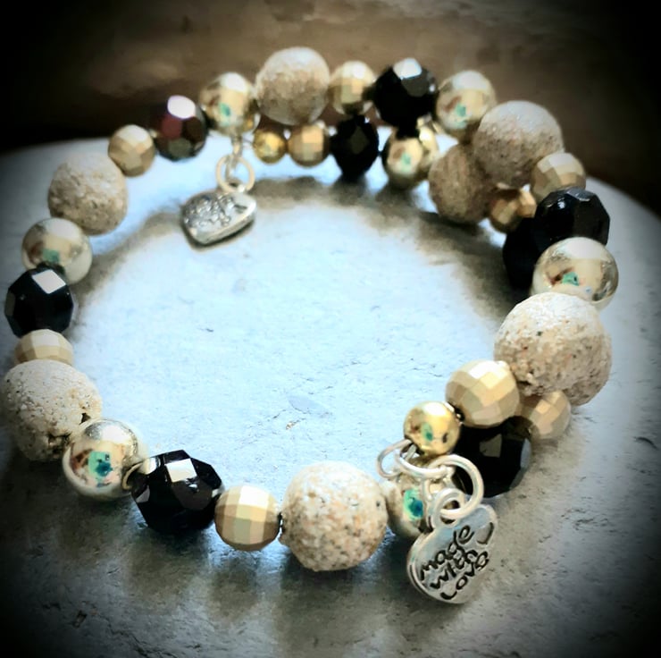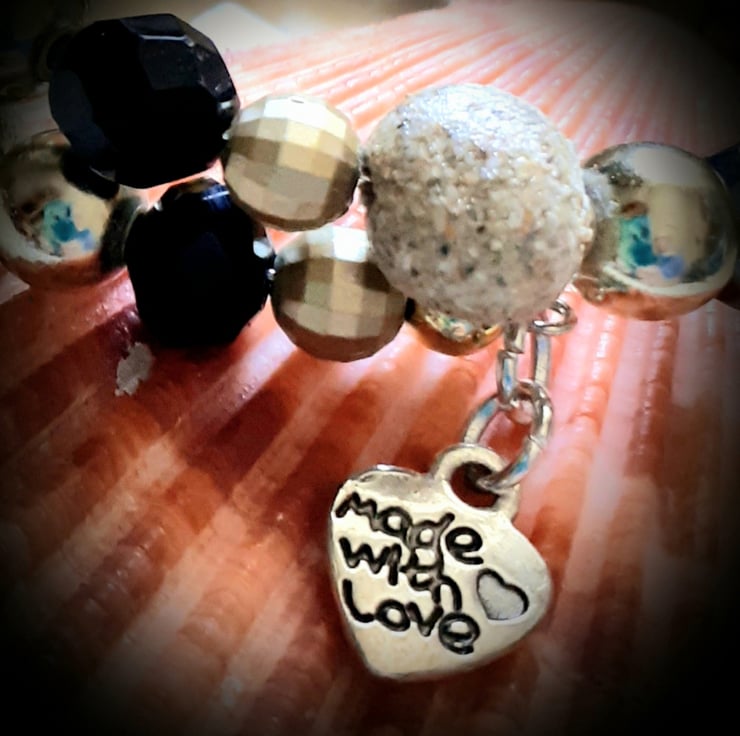 This is a unique handmade sand bead bracelet ..which includes handmade beads using sand from Perranporth beach near Newquay Cornwall..Perranporth being a firm favourite for surfers and live music on the beach....the sand beads together with acrylic beads are threaded on to a memory wire bracelet..therefore making this bracelet suitable for any adult size wrist ...it is finished off with little heart charms with the inscription "made with love"...its a pretty little bracelet ..would make a lovely unusual gift ...