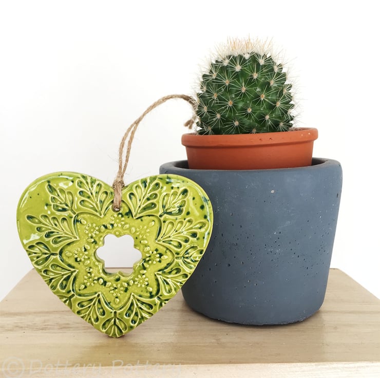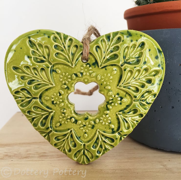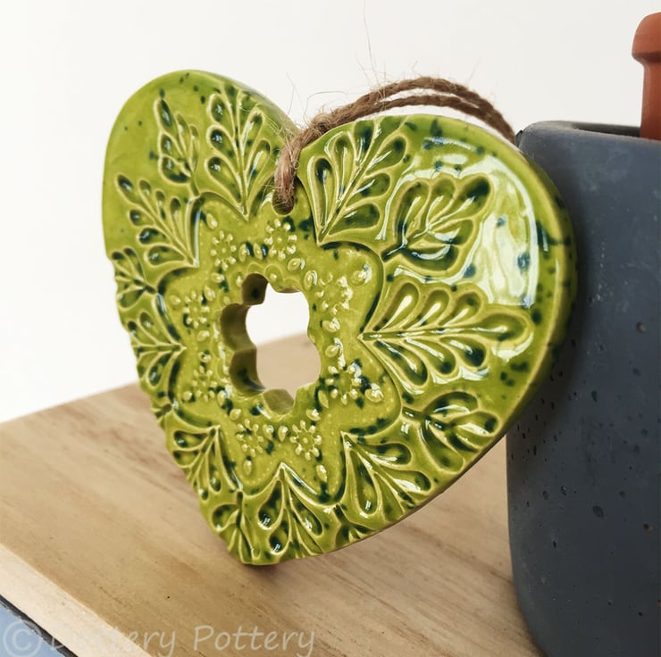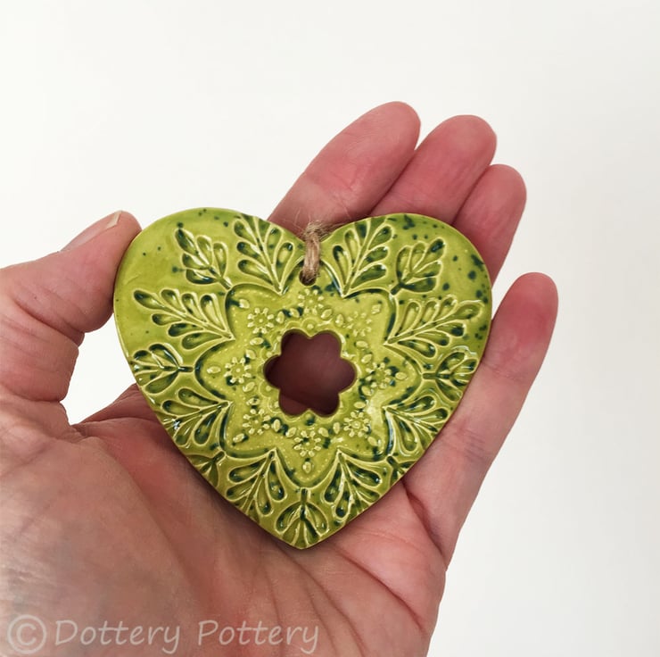 Ceramic heart hanging decoration Pottery Heart Folk art love heart GREEN