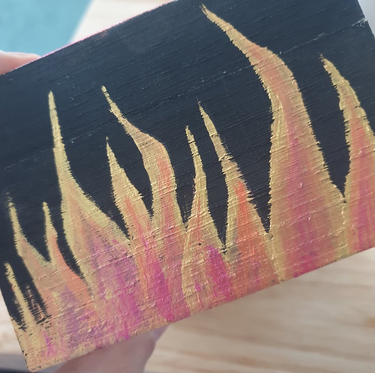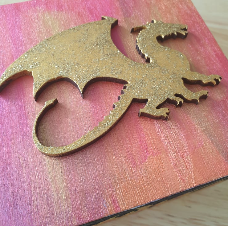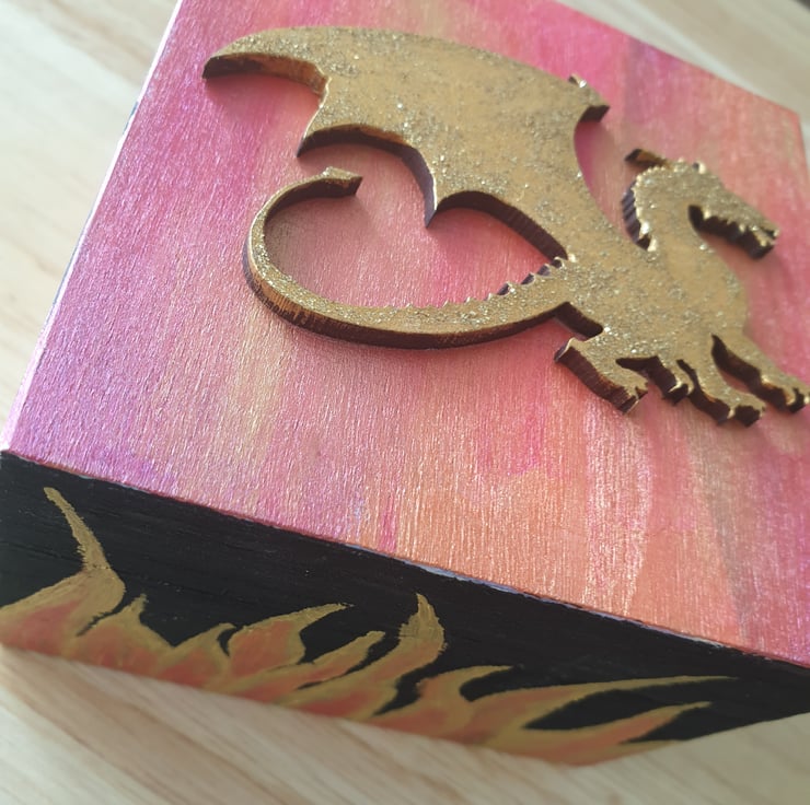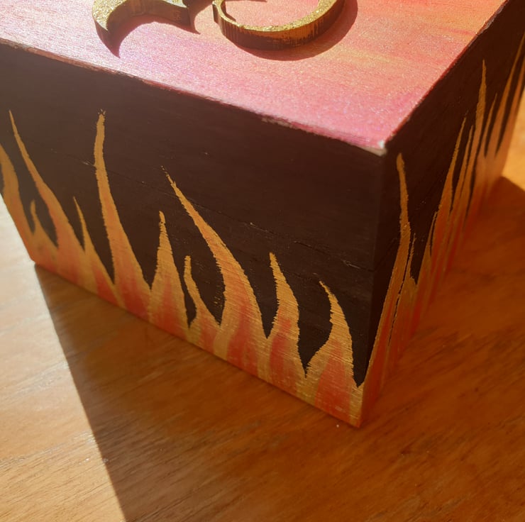 Small wooden dragon box. I have hand painted flames around every side of this box. Finished with a MDF dragon on the top of the box.
