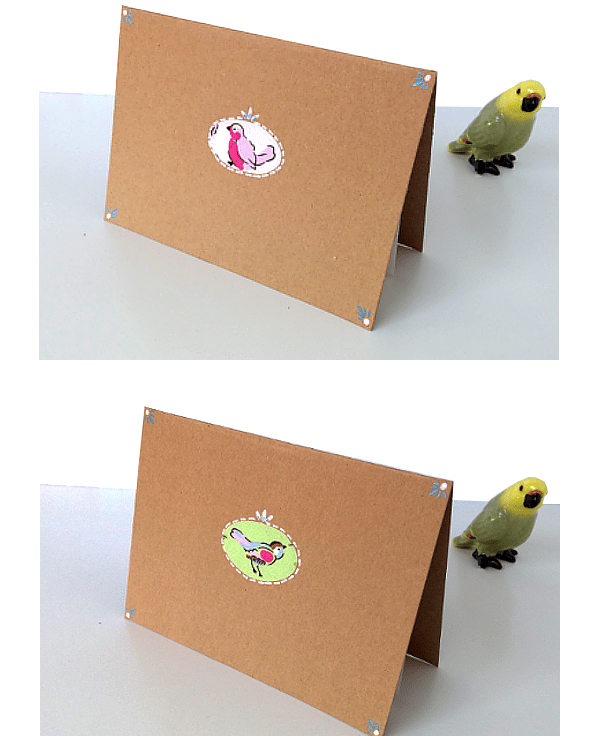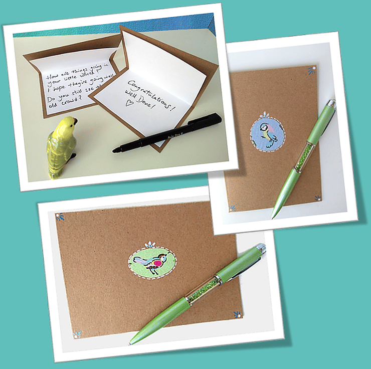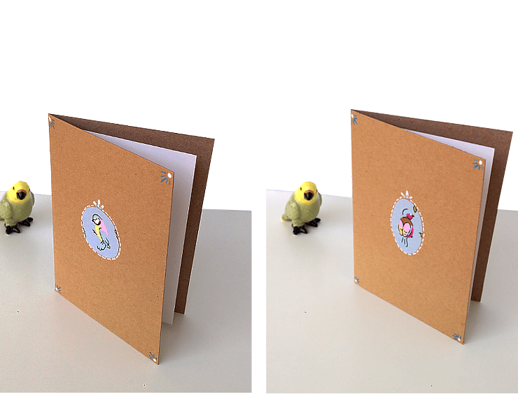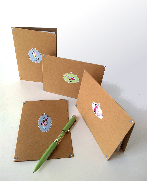This listing is for a set of four blank cards with applique bird detail on the front. The colourful birds are positioned on elegantly decorated, brown cards. Each card has an ivory paper insert for your message.