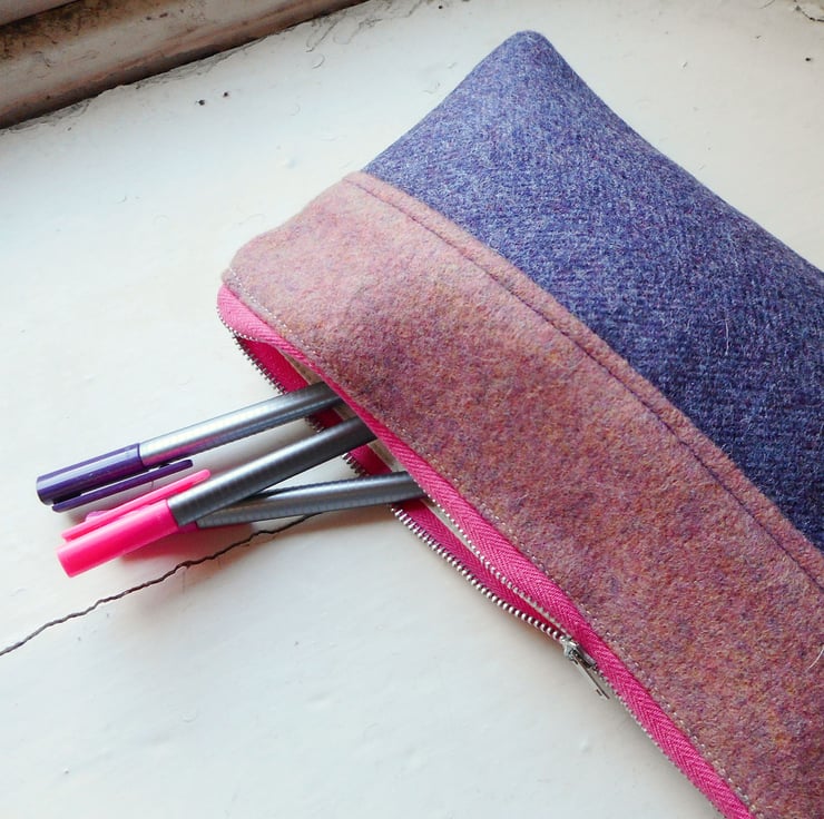 Made from a mixture of wool fabrics. The pink is a felted cashmere jumper, whilst the purple and herringbone used for the back are both wool tweed.
