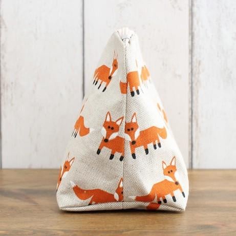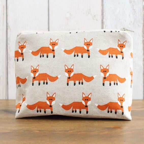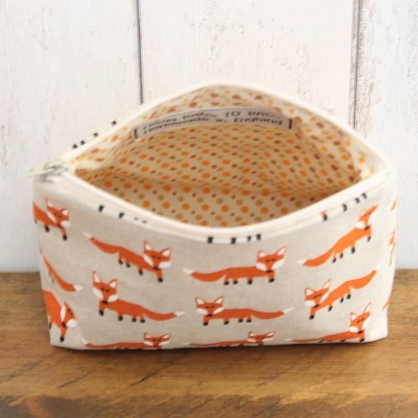 A zipped makeup bag in a linen look fabric with a running fox pattern. Lined with a coordinating spotted cotton fabric, the makeup bag measures 13cm tall x 17cm wide and 8cm deep.