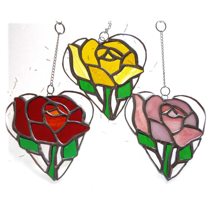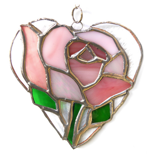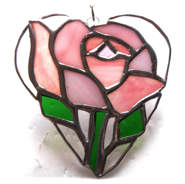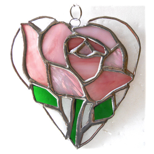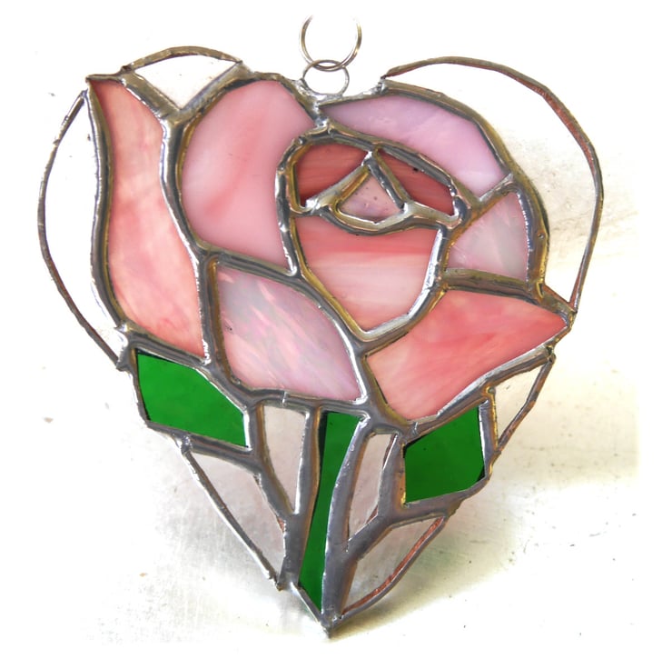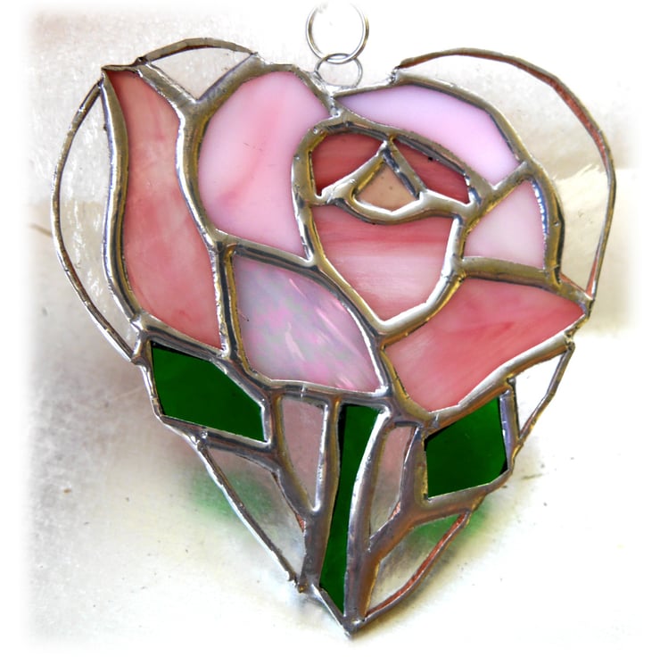 A full bright pink rose in a heart, entirely handmade by me to my own Joysofglass design.