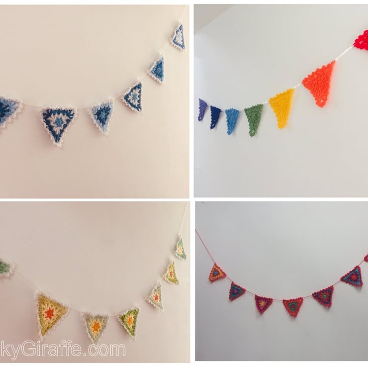 My pattern for some pretty crochet bunting; designed with all the retro fun style of a granny square but just a little daintier. It is great for using up oddments,hung in a row of any length in a themed scheme or all different or all in one colour.Some of mine were inspired by the Caribbean, India and tropical rainforestsl