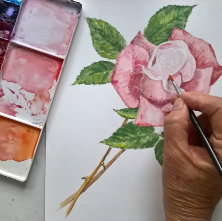 This was a challenge for me to design and paint a botanical painting. I love roses and they are growing right here in my garden.