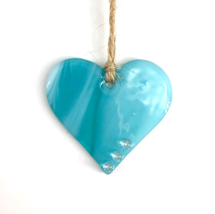 This heart is made from gorgeous, wispy turquoise glass and has three sparkly dichroic glass beads fused on.