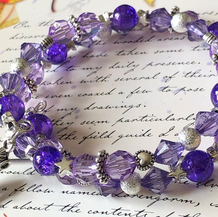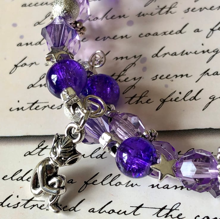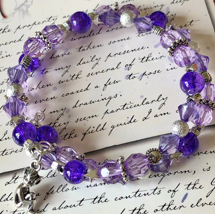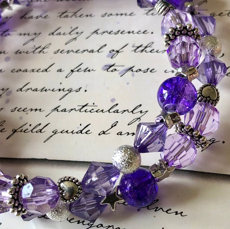 I have added beautiful purple crackle beads, purple faceted beads, stardust beads, heart spacers and pretty star spacer beads.