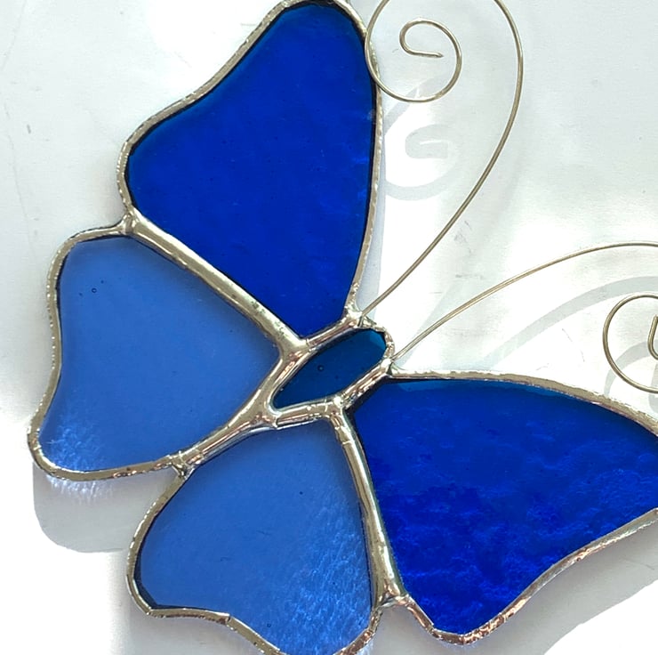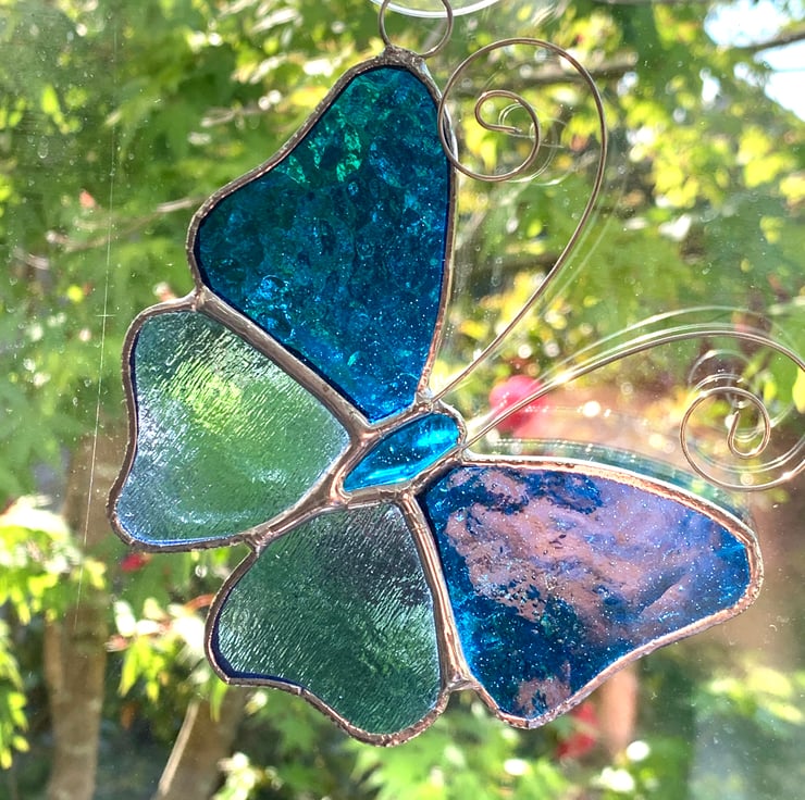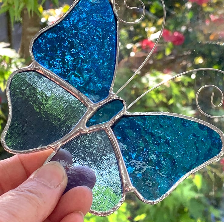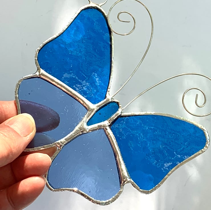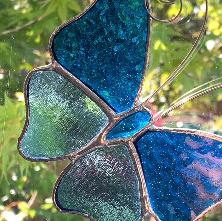 This stained glass butterfly has been made from bright blue corrella glass and pale blue wissmach glass for the wings and petrol blue sea glass for the body.