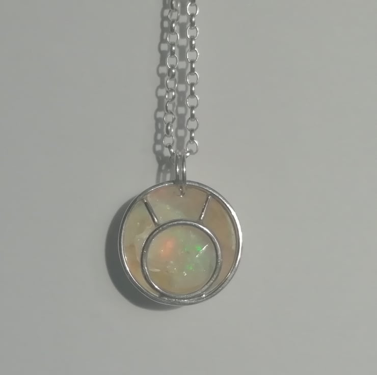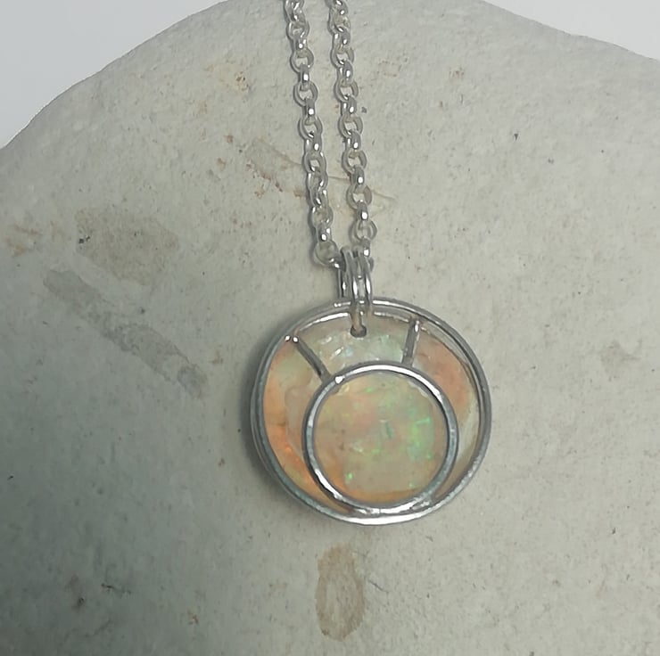 This tiny silver 'dish' has been hand formed from sheet silver. A 'cage' front attached to it and a chip of raw opal trapped inside. The opal chip is almost white but shimmers with shades of pink and pale green when the light catches it. The disc is 17 mm across and is hung on a 45 cm chain.