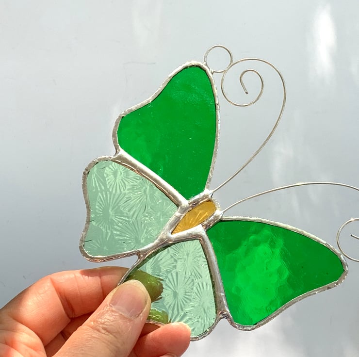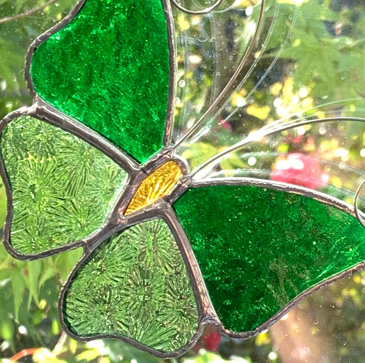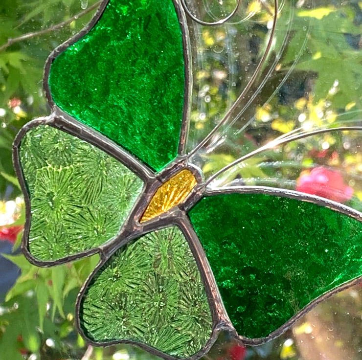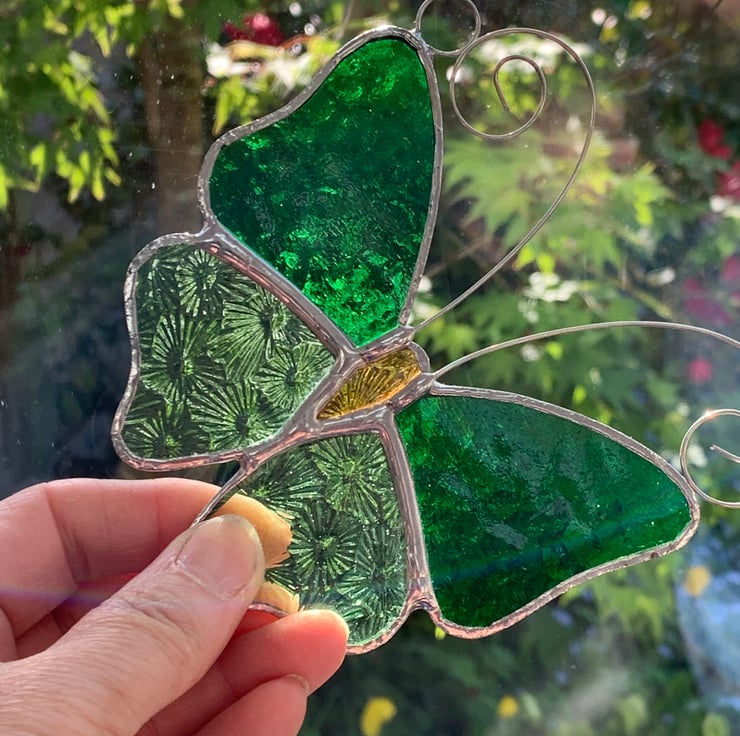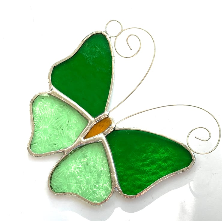 This stained glass butterfly has been made from green corrella glass and pale green florentine glass for the wings and amber florentine glass for the body.