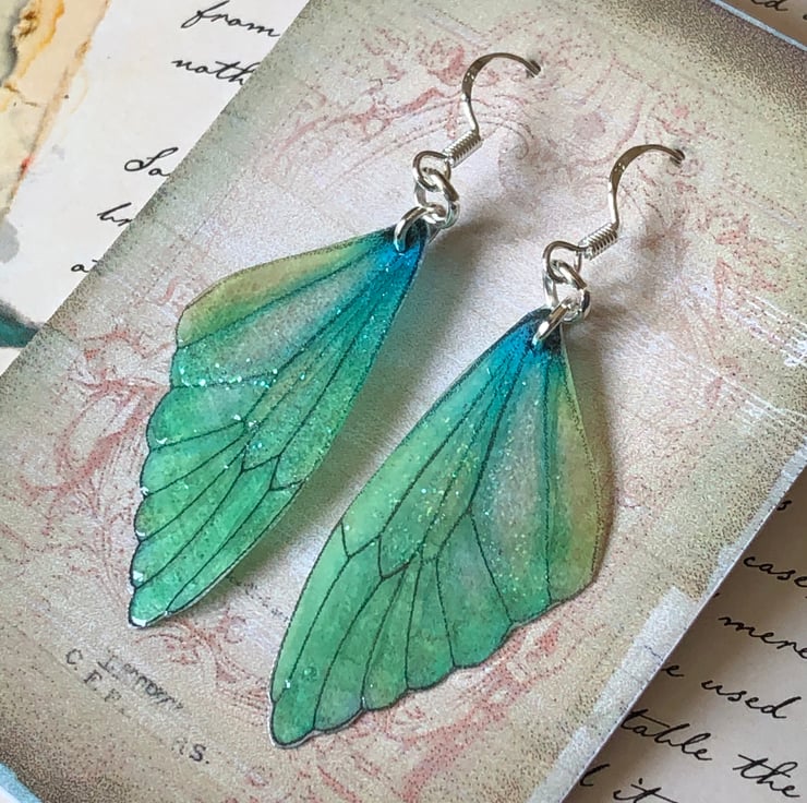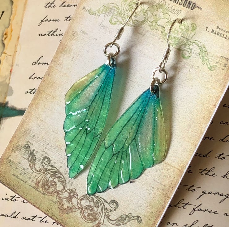 Beautiful green with a delicate tint of lemon and blue fairy wing earrings on sterling silver hooks.