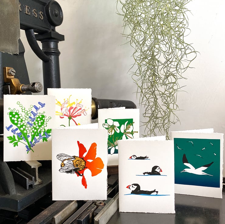 These are original linoCut Cards handprinted in a minimum of two colours, with metal letterpress text hand-printed on the back, inked by hand & printed on my old Adana Press.