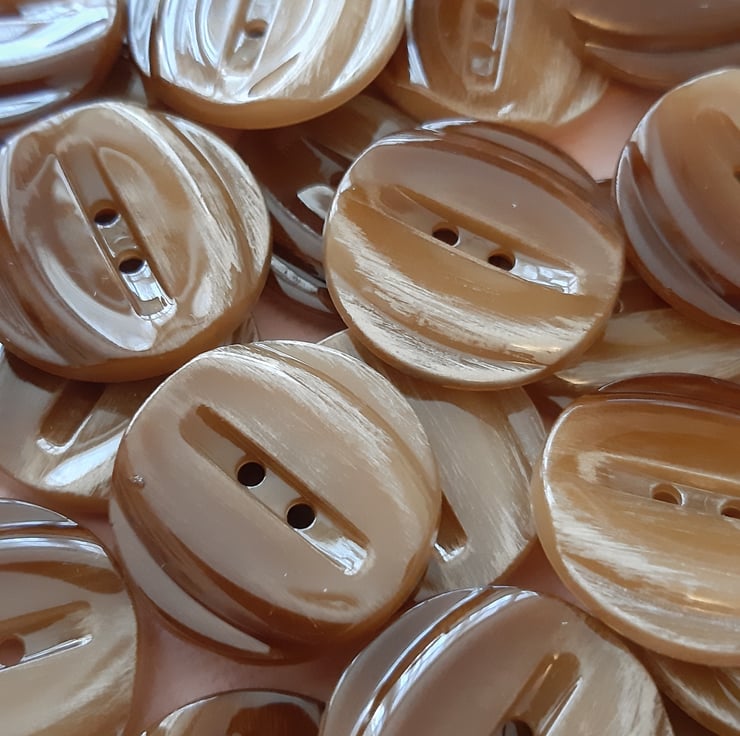 10 glossy caramel brown chunky buttons 23mm in diameter, 2 holes. Countersunk centre and a bevelled edge on 2 sides. New. Plastic. They look good enough to eat!