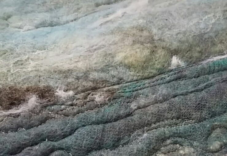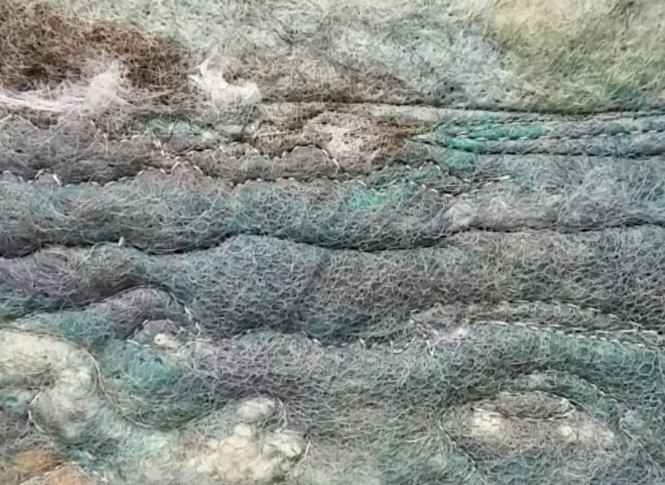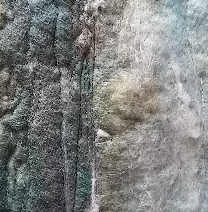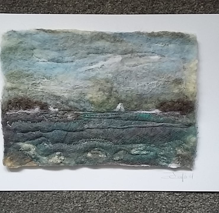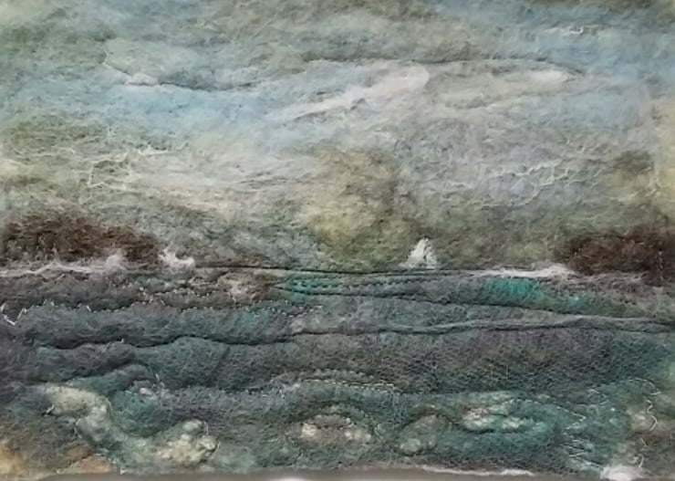Using wool fibres wet felted into a turbulent seascape in greys and blues.
