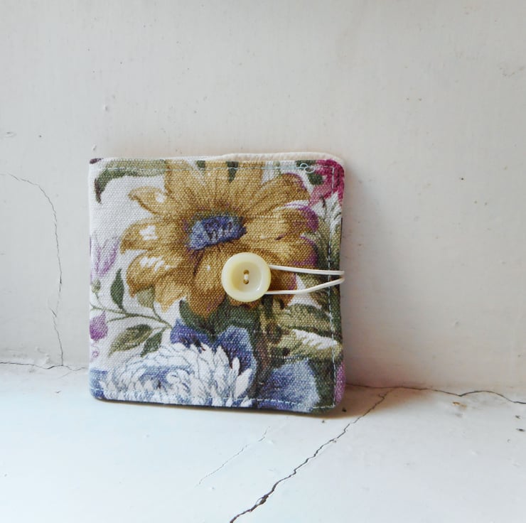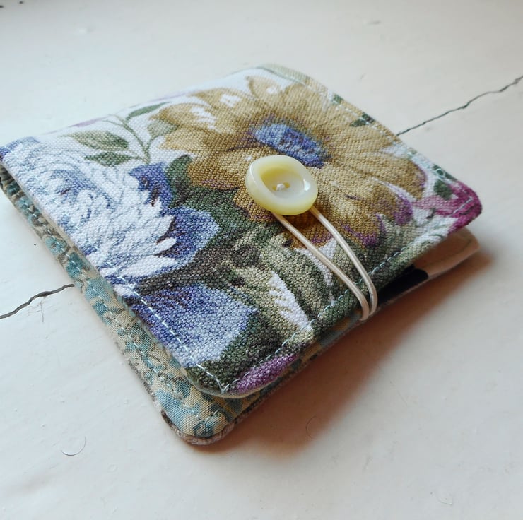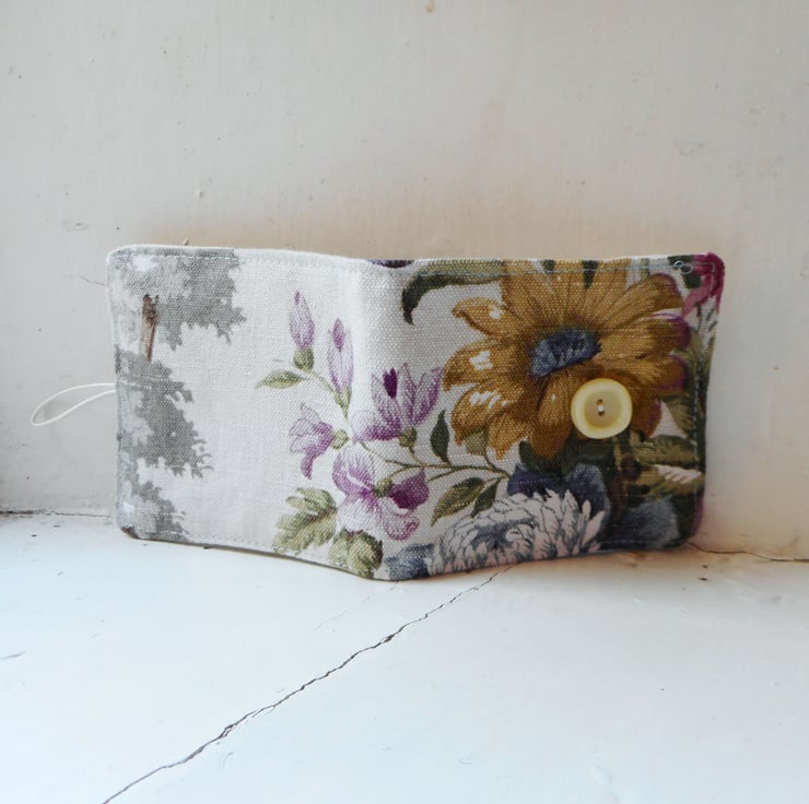 Wallet is made from a recycled floral cushion cover in a Sanderson floral. Faded grey, mustard and pinks mix with various greens and blues in the foliage.