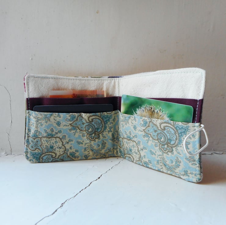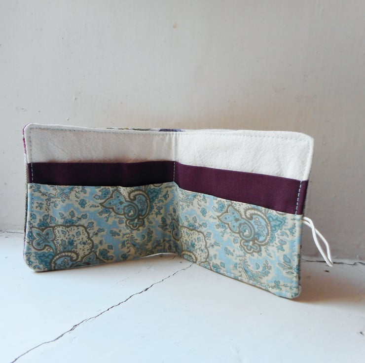 Internally it is constructed from ivory cotton muslin, with cotton quilting fabric pockets in a deep aubergine and floral turquoise. The four pockets are perfectly sized for credit or debit cards, but notes will have to be folded. They're also perfectly sized for individual teabags, so if you prefer to take your own supplies, you're sorted here!