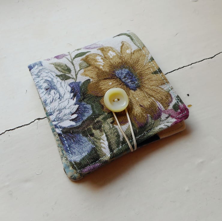 Simple fabric wallet with elastic loop and button closure. The finished wallet is lightly interfaced so is fairly soft.