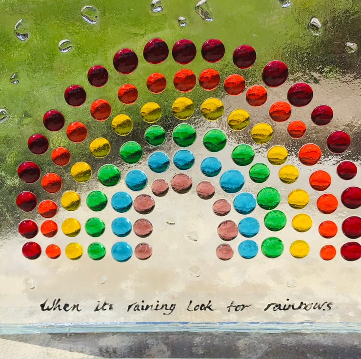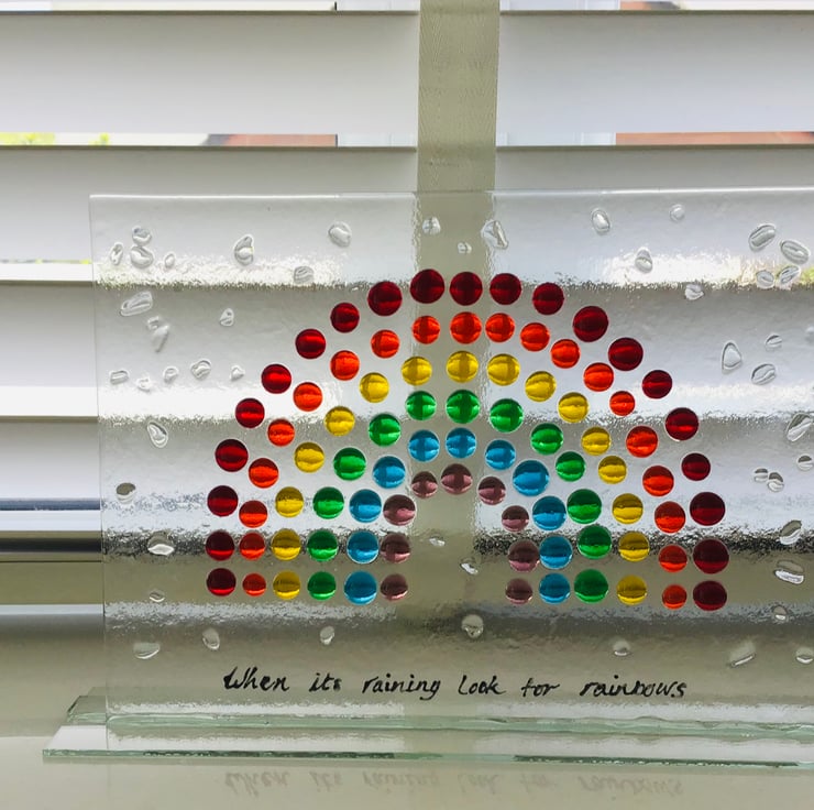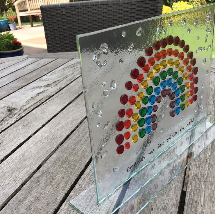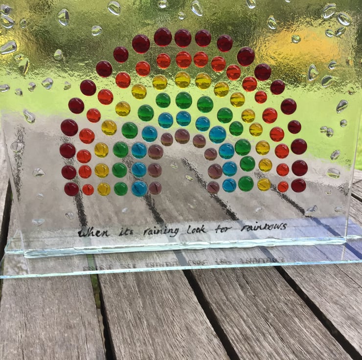 Stunning rainbow of hope free standing picture . Approximately 7 inch high by 6 inch wide free standing glass picture of a rainbow of hope . The fused glass beads are made first by taking the kiln to a very high temperature . Then in a separate firing the rainbow is formed and the writing added in glass enamel . All fused glass and unique . All items are hand crafted and individual so may vary slightly