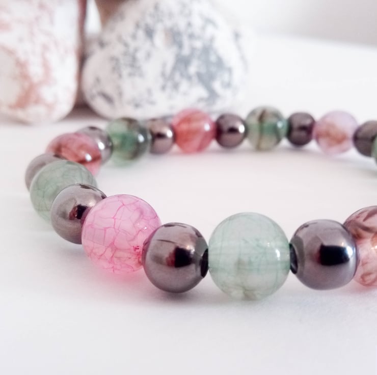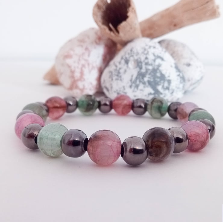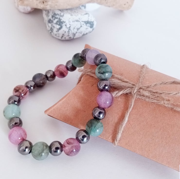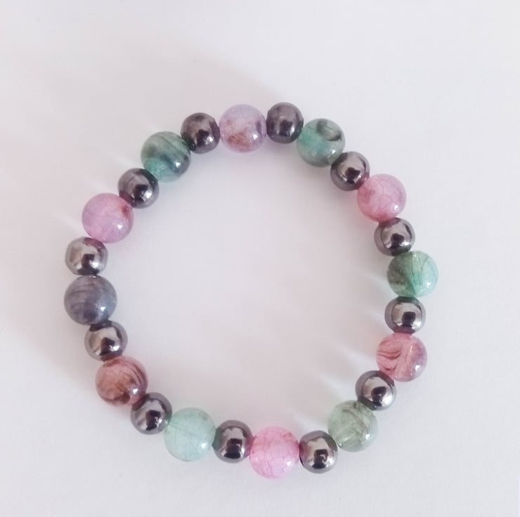 This hand crafted bracelet uses a selection of acrylic and metal beads to give a pretty finish. The beads are threaded on elastic cord, and is approximately 8.5inches. Due to the size it could be classed as an extra large ladies, or is perfect if you like your bracelets loose.