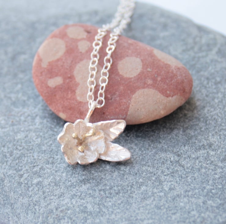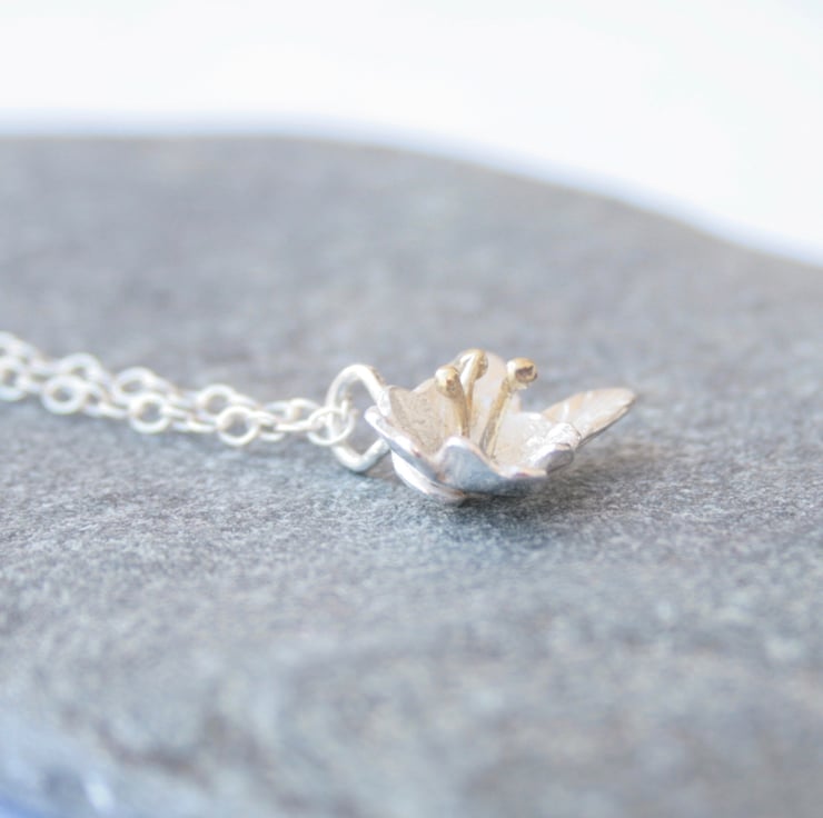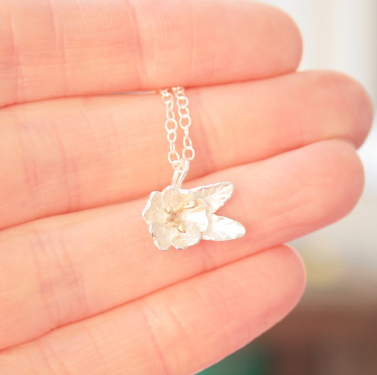 I have handmade it from sheets of sterling silver and a little bit of brass wire to make the stamen in the centre of the flower. It's a very dainty necklace and will look lovely worn in the Spring and Summer over a t-shirt or a simple jumper.
