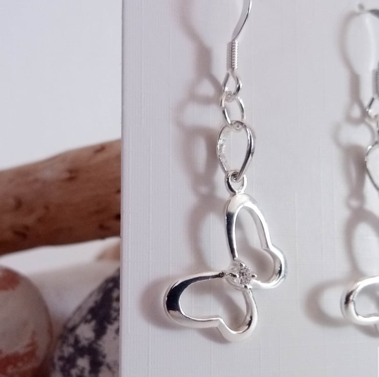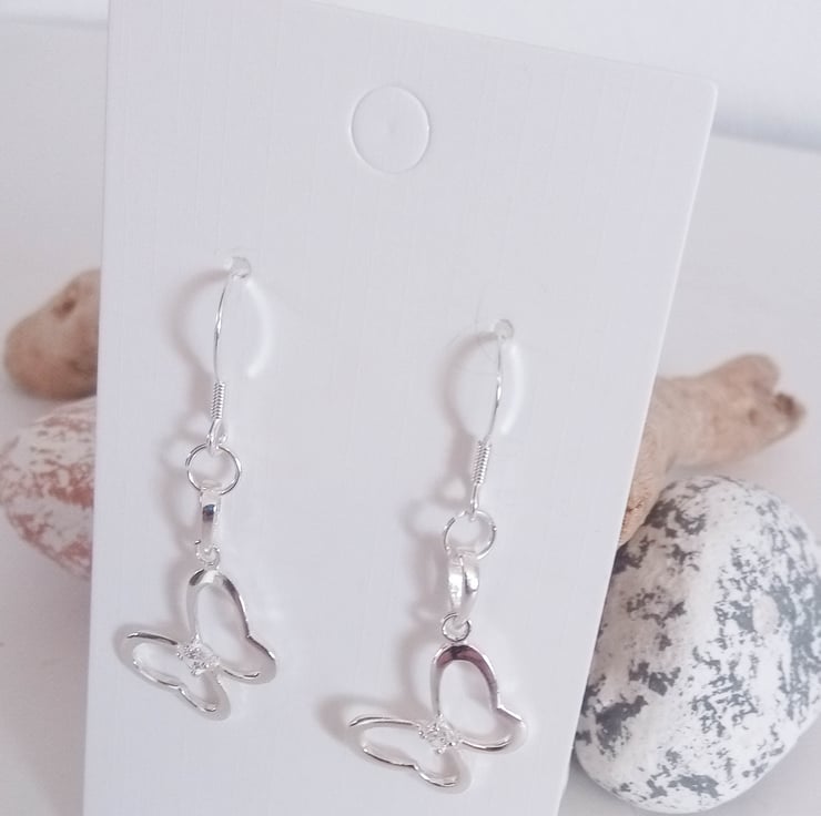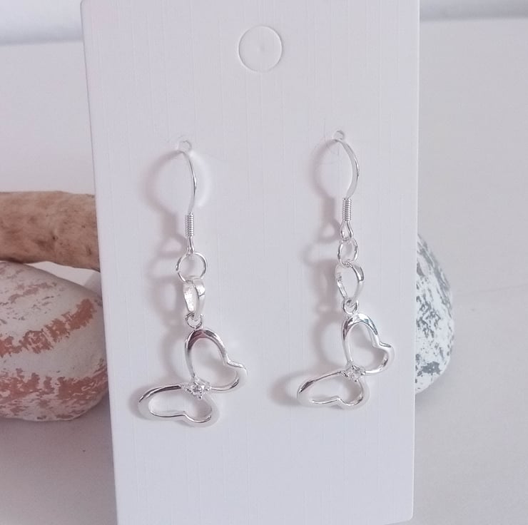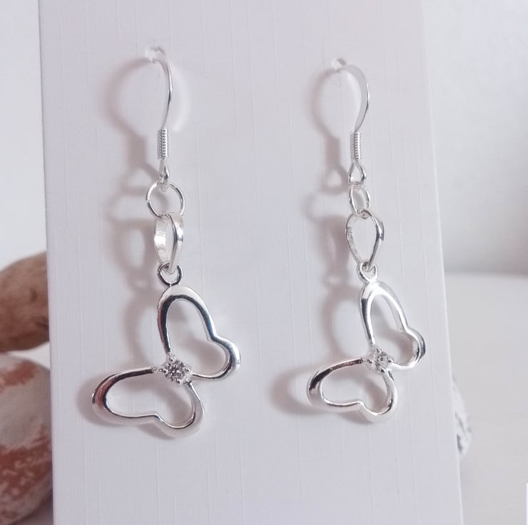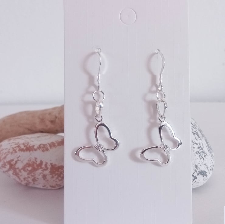 These earrings each feature beautiful sterling silver butterfly charms, and in the middle of each charm there is a cubic zirconia gemstone. The butterfly charms are approximately 19mm x 13mm.