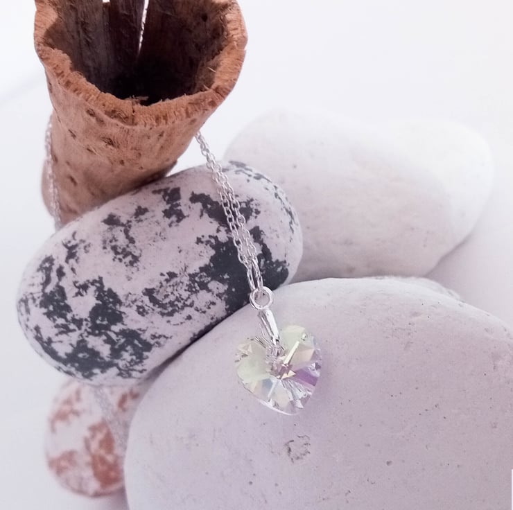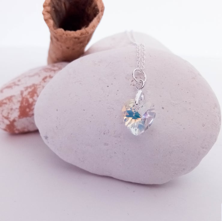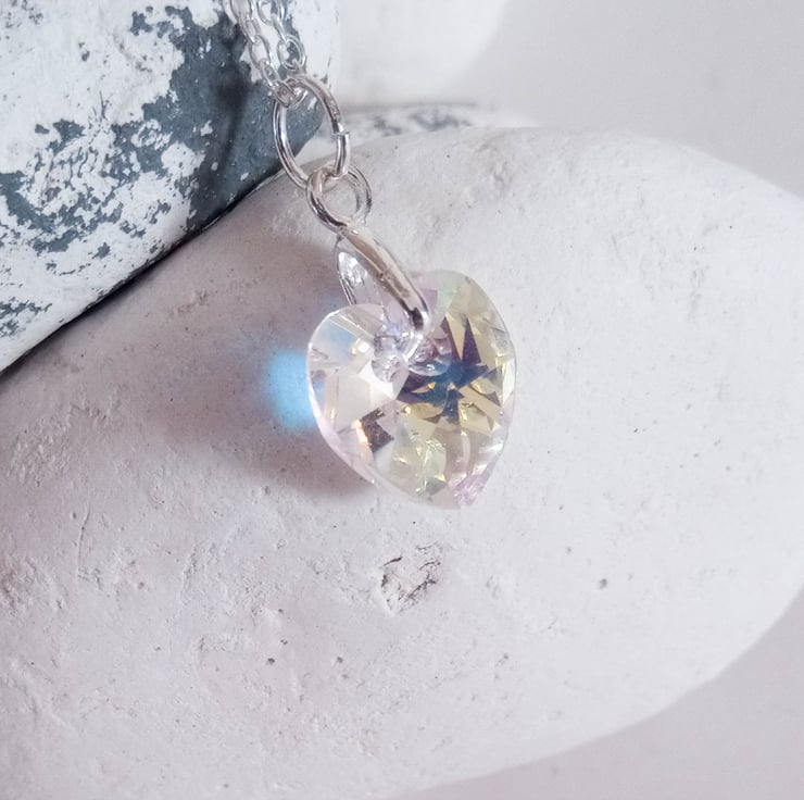 This eye catching preciosa AB crystal heart pendant sparkles in the sunlight. AB, also known as Aurora Borealis crystals, rainbow crystals or AB rhinestones, are unique in that they reflect the colours that surround them. The heart pendant hangs from a sterling silver necklace.