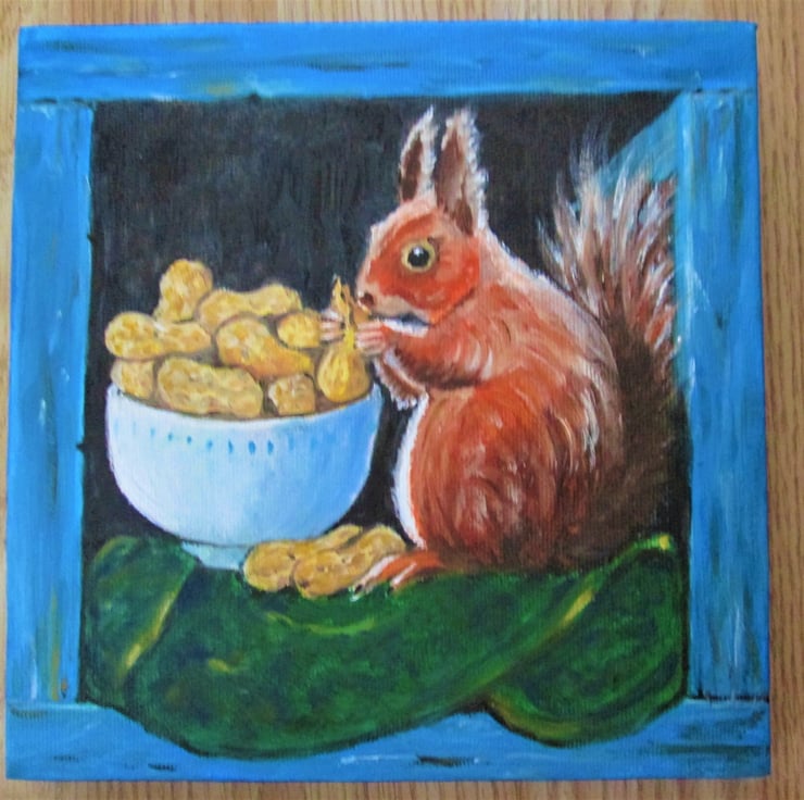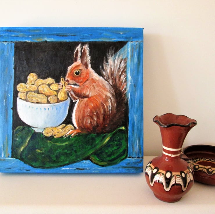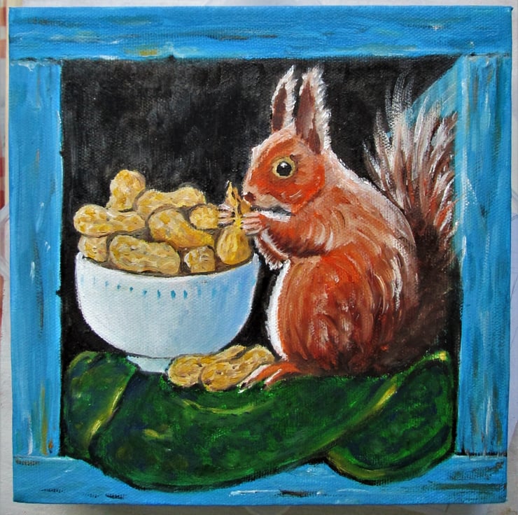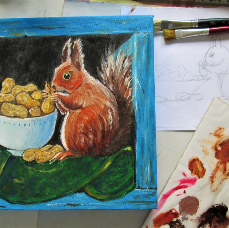 An original oil painting on stretched cotton canvas. A cute squirrel painting in professional oil paints.