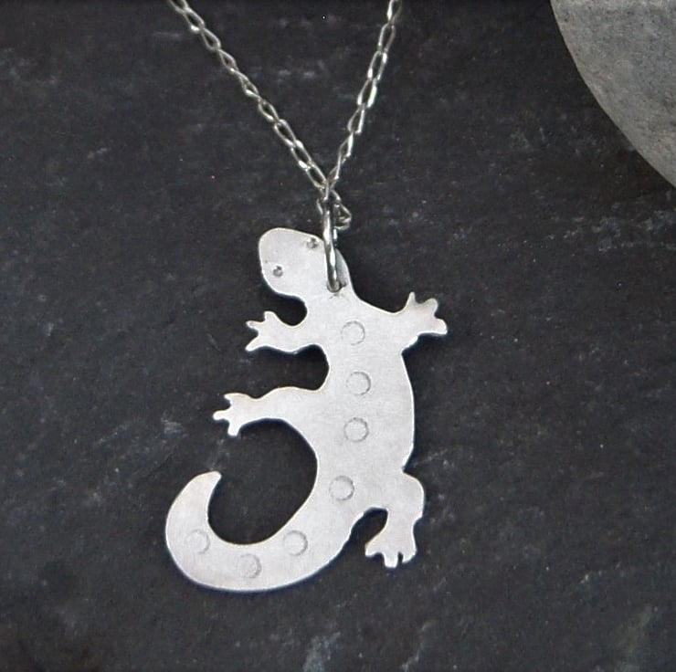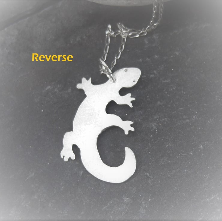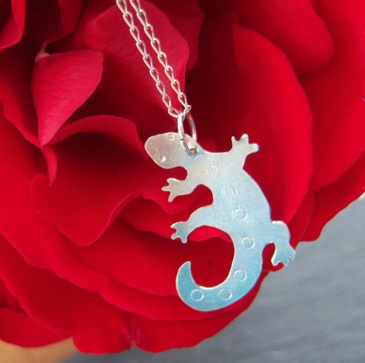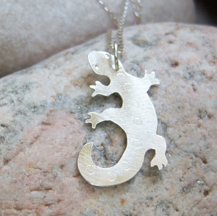 Is this a lizard or a salamander, a newt, a skink or a gecko? You decide! It's cut from sterling silver sheet and measures approximately 3 cms long. The front has a plain finish with little circles indented down the middle of the back. The back has a frosted effect.