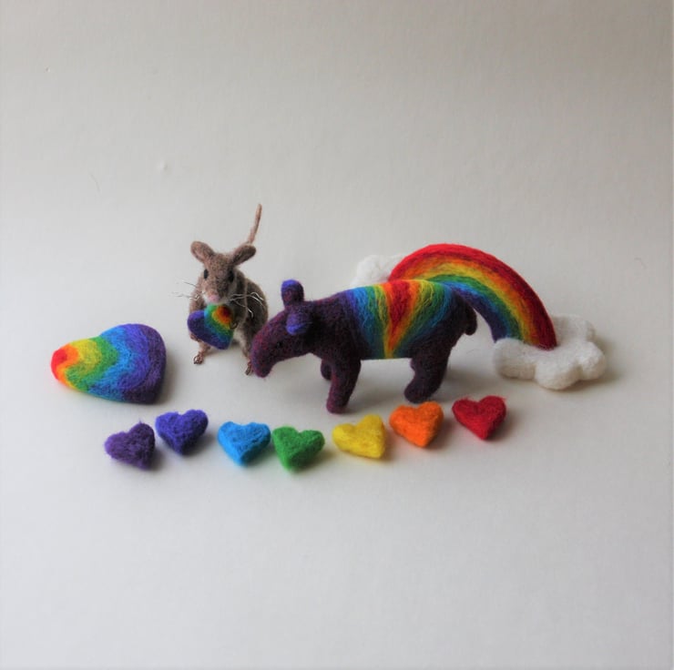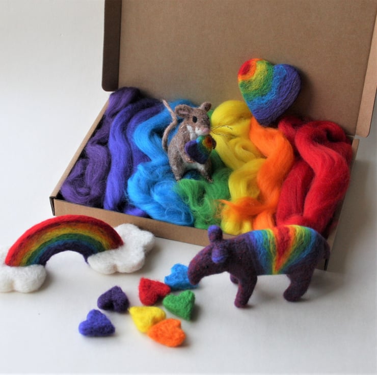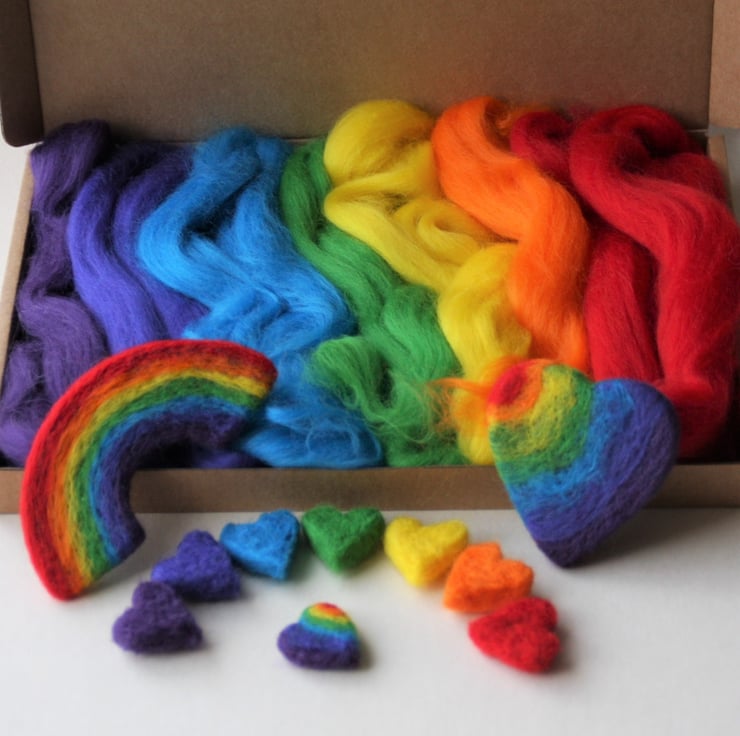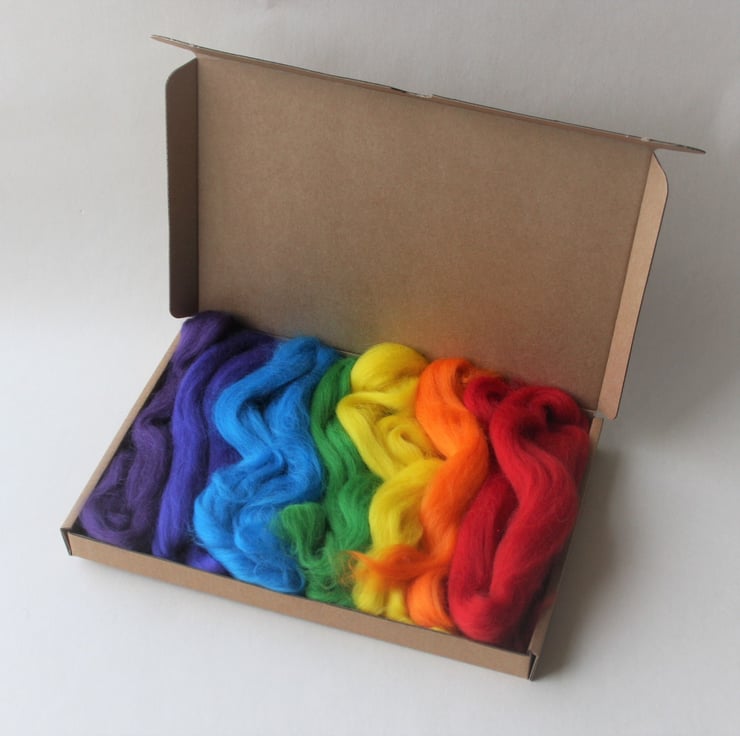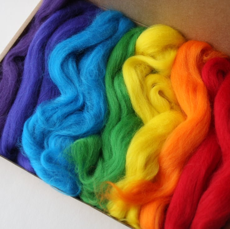 A letterbox sized pack of lovely combed merino wool tops in rainbow colours. Shades may vary slightly, but you will receive seven gorgeous rainbow colours in each pack. 35g of wool in total (7 x 5g hanks). Use for either wet or needle felting your own rainbows, or for adding some rainbow colour to other projects.