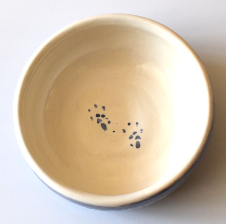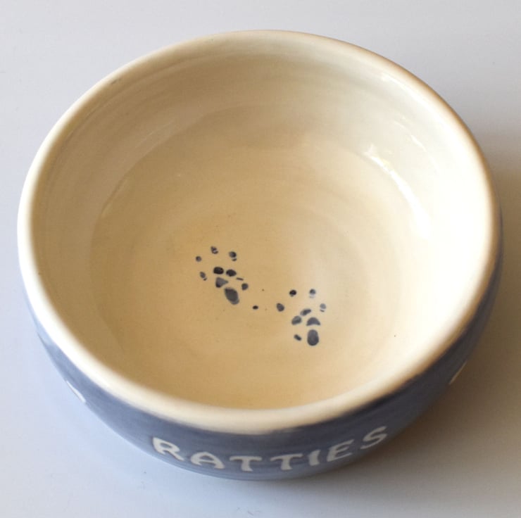 Wheel thrown handmade pottery pet rat bowl with 'RATTIES' on the outside.