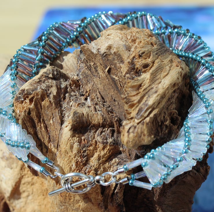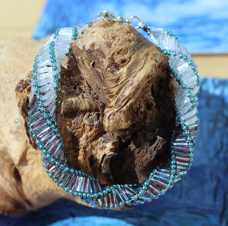 Pale pink and light blue and white bugle beaded bracelet with teal seed beads on edge finish of with a tibetan silver plated toggle clasp will come gift packaged