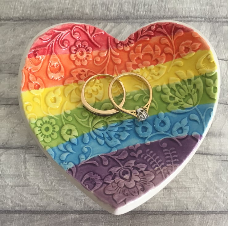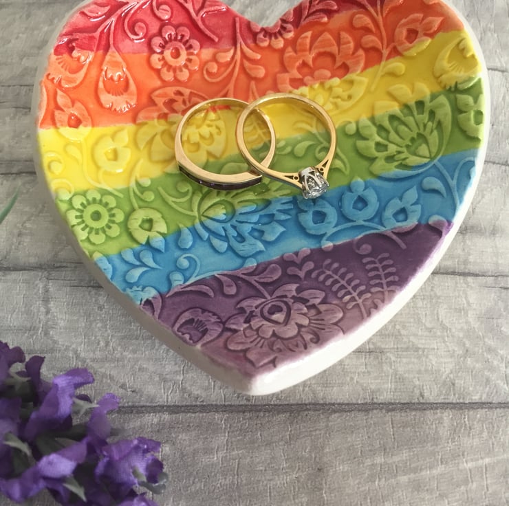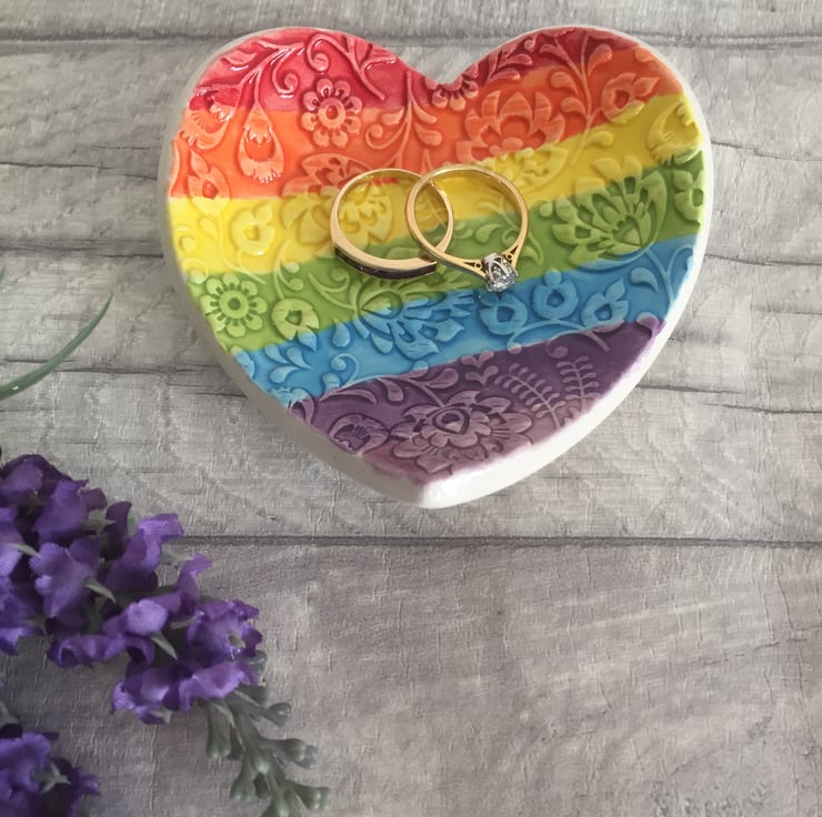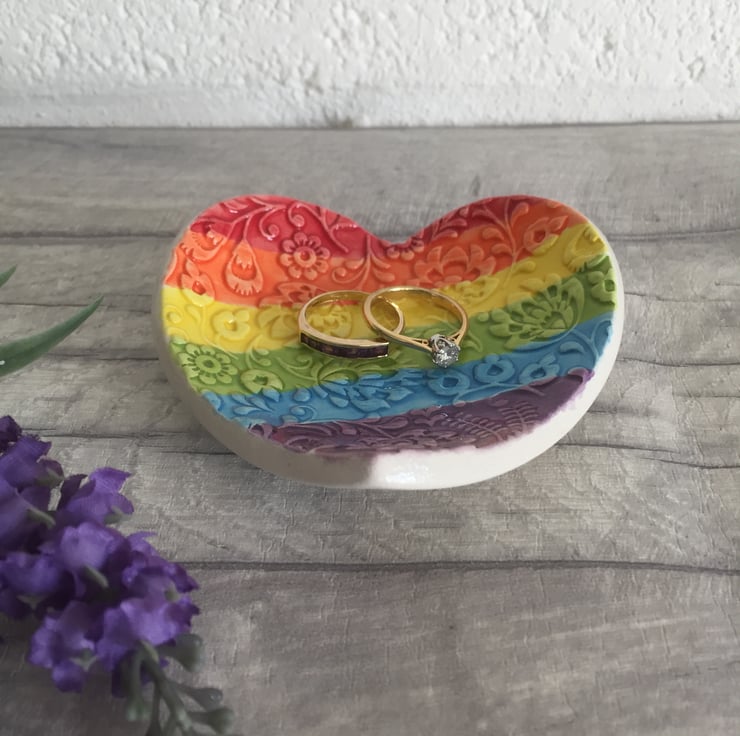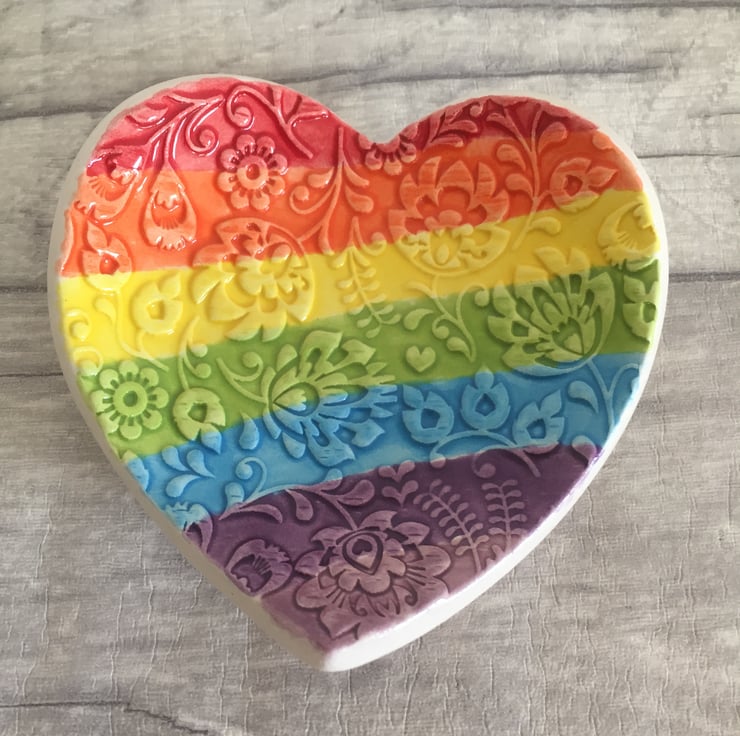 The dish has been individually made by rolling out clay and then rolling the flower pattern onto the clay. Next I cut the heart shape out using a cutter and shaped it into a dish form. Once dried the clay was then fired in my kiln. Once fired to bisque ware, I painted the rainbow design on it in underglazes, then clear glazed it and gave it it’s final firing.