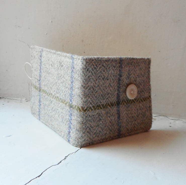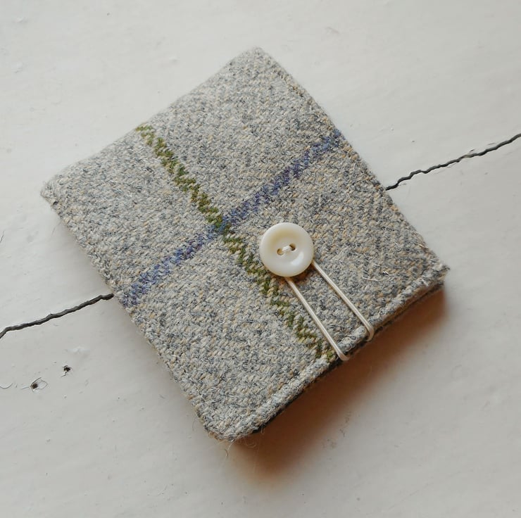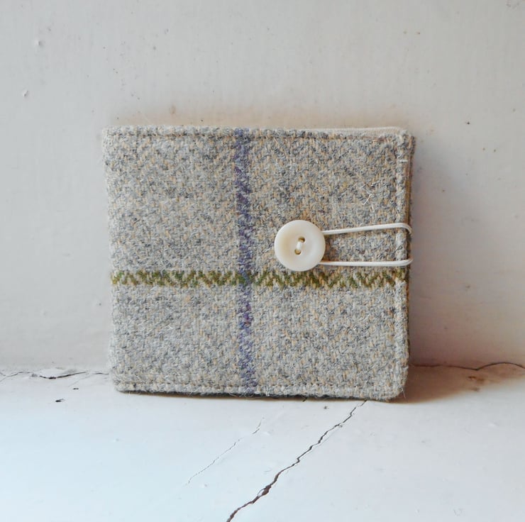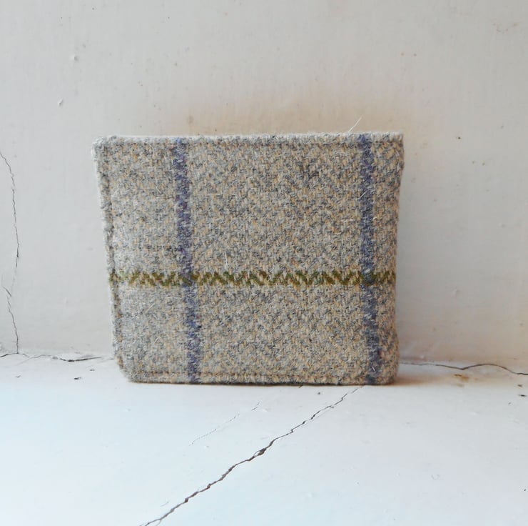 Wallet is made from offcuts of harris tweed in a faded grey background with purple and olive green check lines.