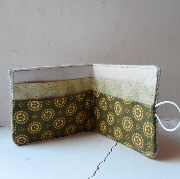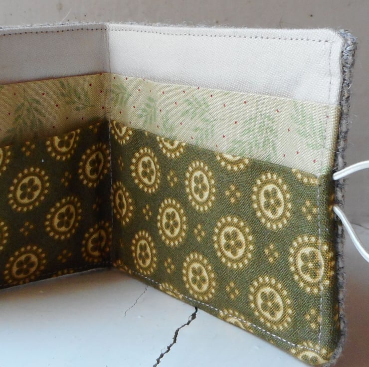 Internally it is constructed from ivory cotton muslin, with cotton quilting fabric pockets in toning olive greens, one is printed with a leaf design whilst the bottom pockets have a more graphic floral repeating pattern. The four pockets are perfectly sized for credit or debit cards, but notes will have to be folded.
