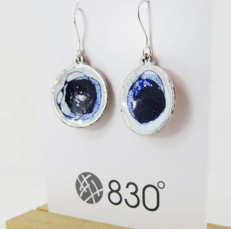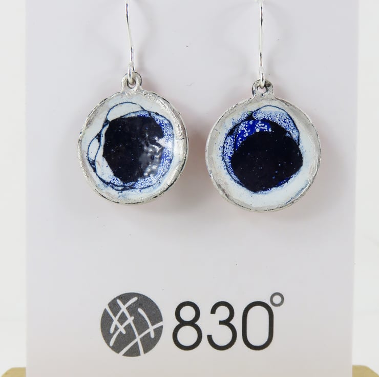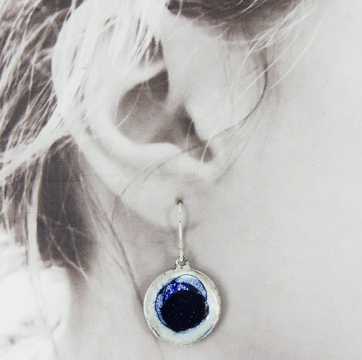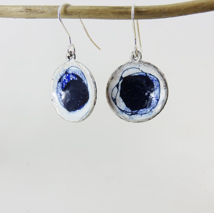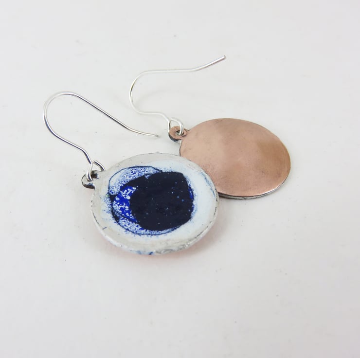 20mm circle copper dangle earrings are domed. They are then painted with dark blue enamel and fired in the kiln. Another layer of white enamel is applied with a hand drawn swirl through the white layer. A final layer of dark blue clear enamel is dabbed into the centre and real silver is applied to the edges and fired once more. The backs are a shiny copper. Hung on silver earring hooks for pierced ears. Fired in the kiln at 830 degrees. Each item is unique due to the making process.