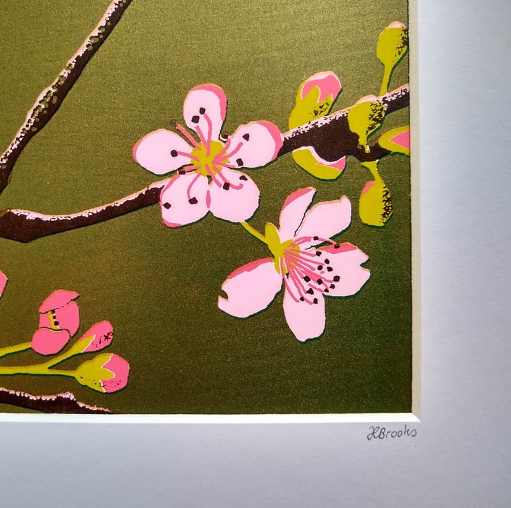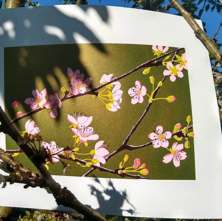 This print is inspired by the blossom on an apple tree in our garden which brings us an abundance of tasty apples every year! This print turned out differently to how I imagined at the start of the design process! The best thing about creating a print is when you complete your final layer and it looks great - unfortunately I didn't get that buzz until I experimented with adding a gold metallic layer over the base layer. It adds a luxury feel to the print and as the gold glistens in the light it feels a lot more spring like.