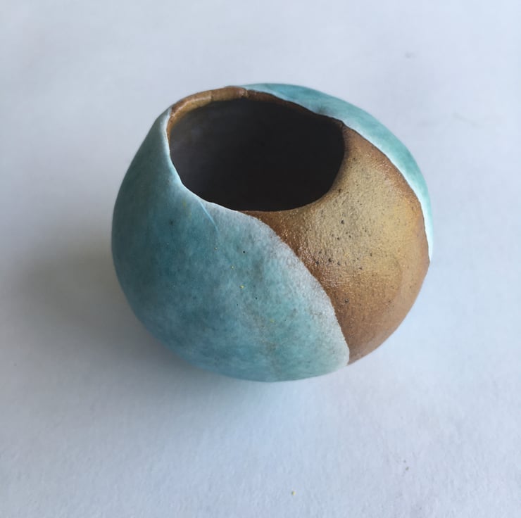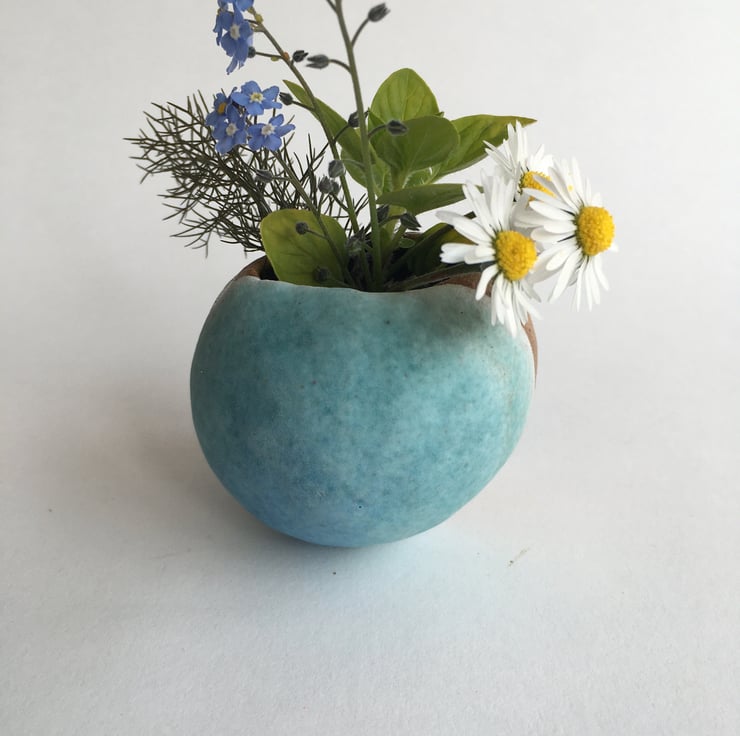 Pinched from an iron rich stoneware clay, the vases have been glazed inside with a white matt glaze and a turquoise added onto the outside. Speckles of iron come through he glaze.