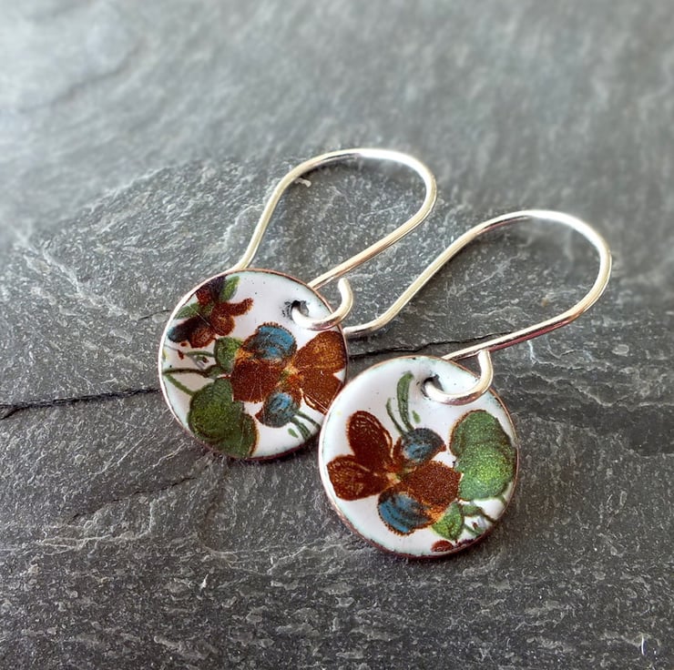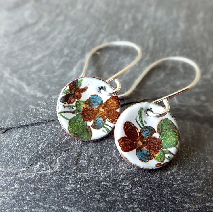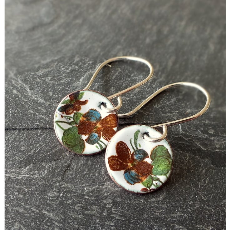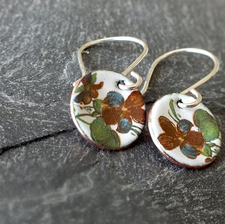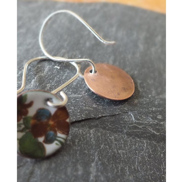 White enamelled earrings, featuring tiny images of flowers. Each disk is slightly concave, measures 12mm in diameter and has a natural copper finish on the back. The earring wires are handmade from sterling silver and the copper disks are made from metal reclaimed from piping from a microbrewery, near my studio in Cardiff.