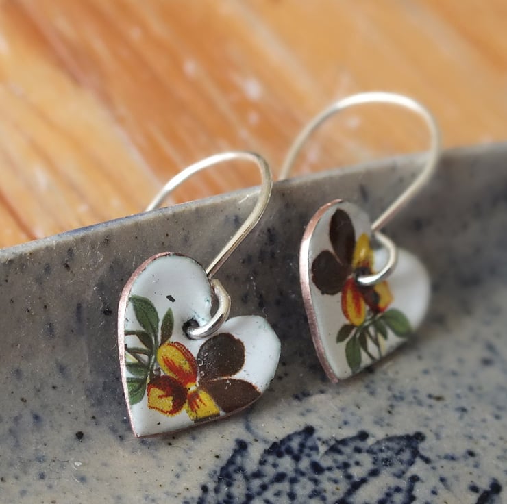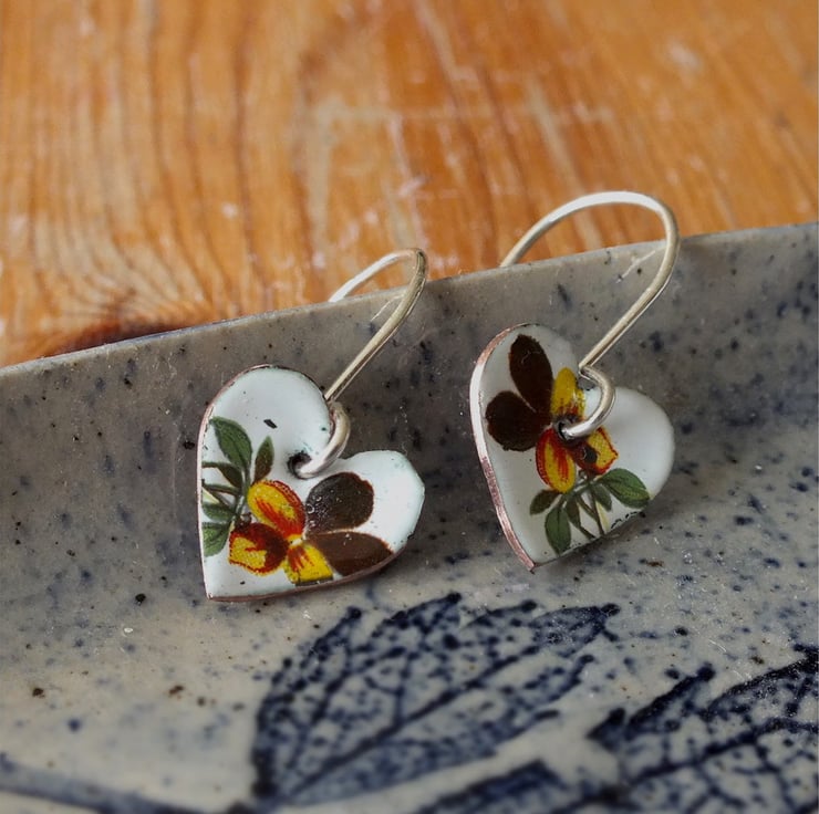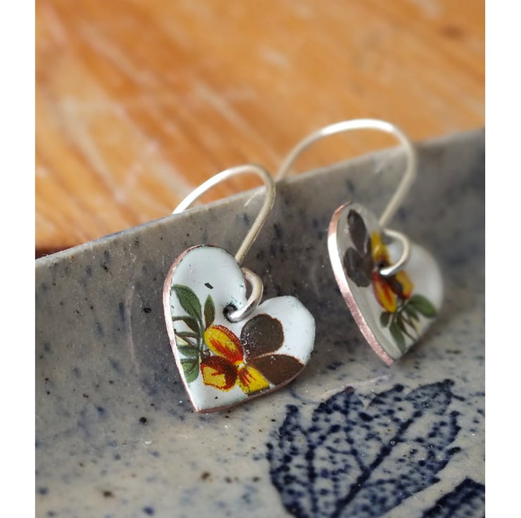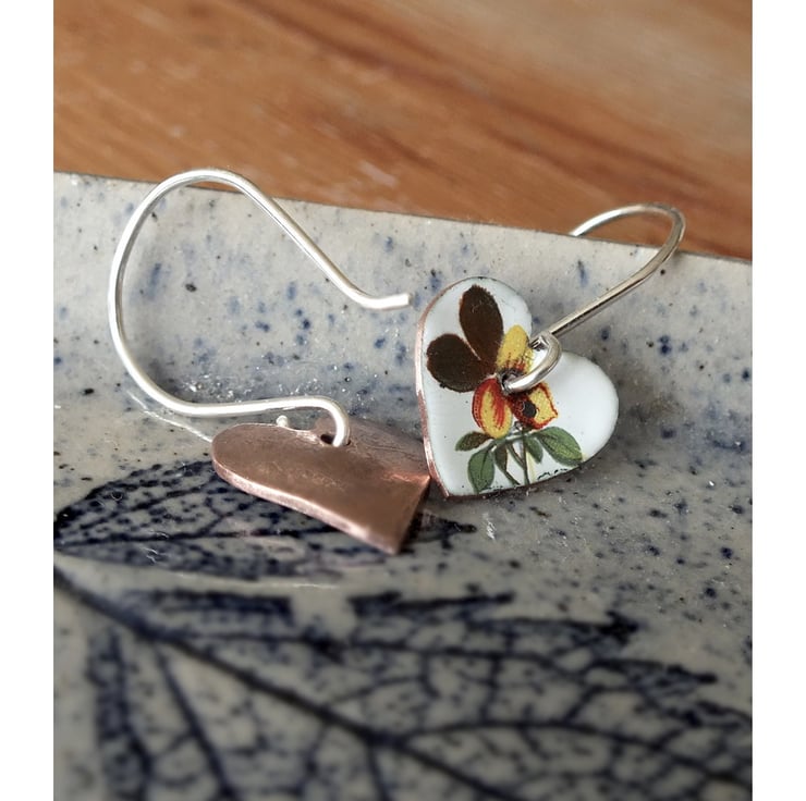 White enamelled heart shaped earrings, featuring tiny images of flowers. Each disk is slightly concave, and has a natural copper finish on the back. The earring wires are handmade from sterling silver and the copper hearts are made from metal reclaimed from piping from a microbrewery, near my studio in Cardiff.