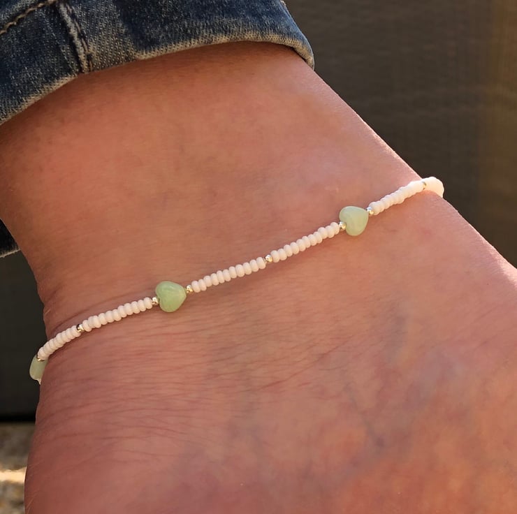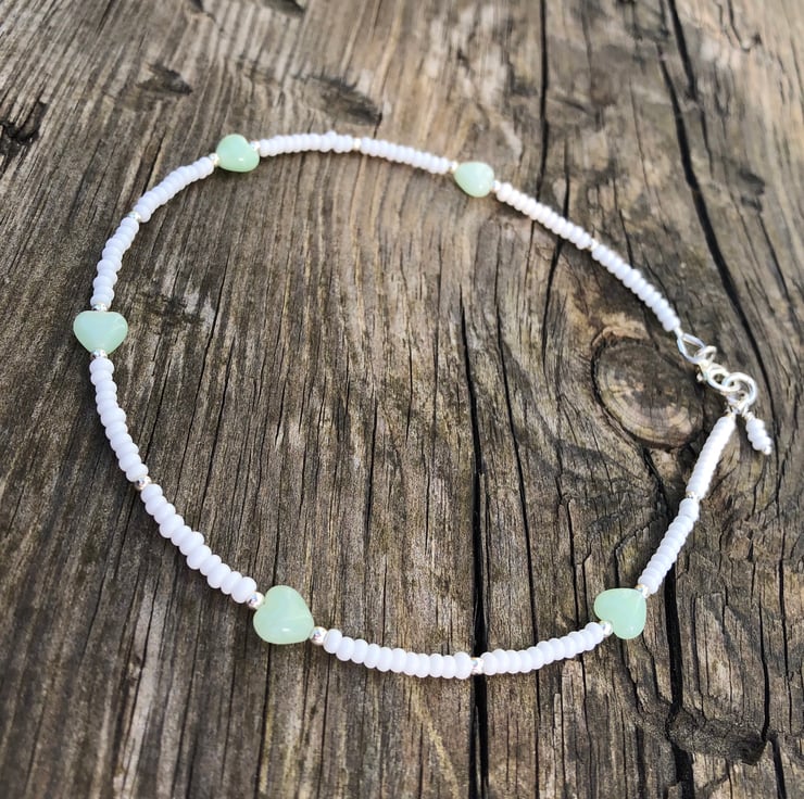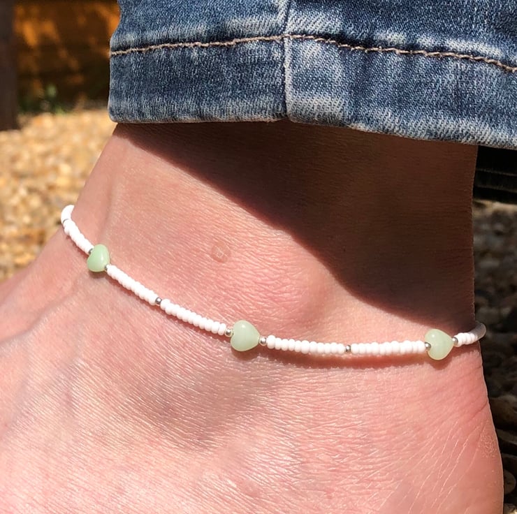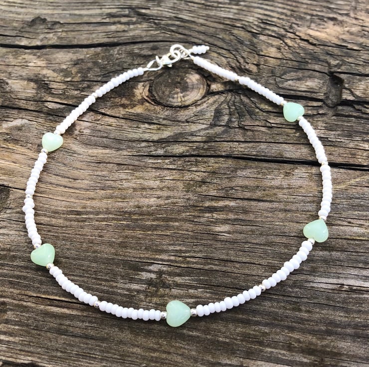 This anklet has been handmade using pale green Czech glass hearts, beaded into strong tiger tail wire with white seed beads and sterling silver beads.
