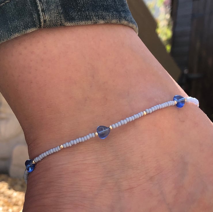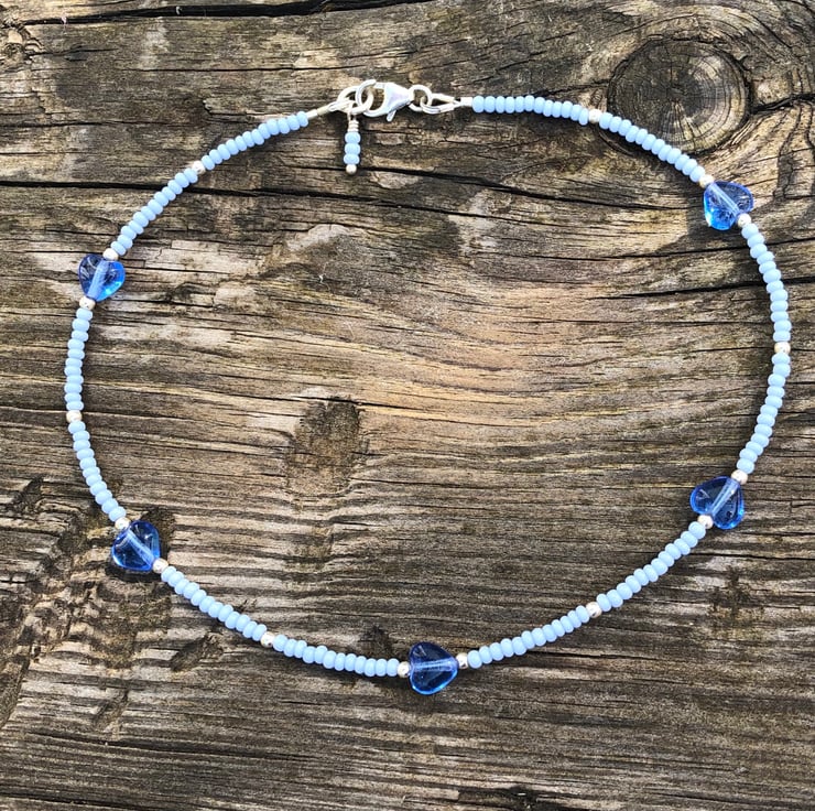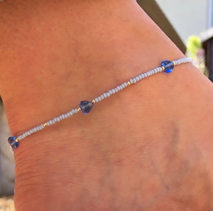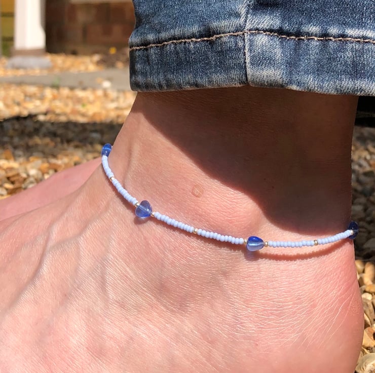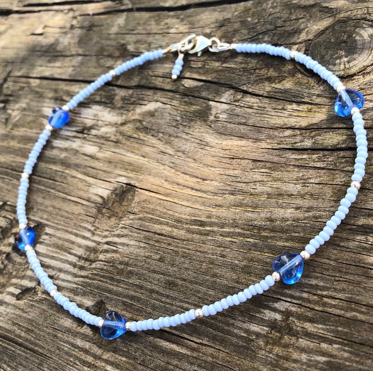 This anklet has been handmade using pale green Czech glass hearts, beaded into strong tiger tail wire with white seed beads and sterling silver beads.