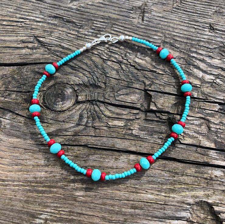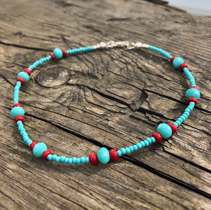 Handmade anklet made using turquoise faceted crystals along with red and turquoise Czech glass seed beads. Beaded onto strong beading wire and fastened with a sterling silver lobster clasp.