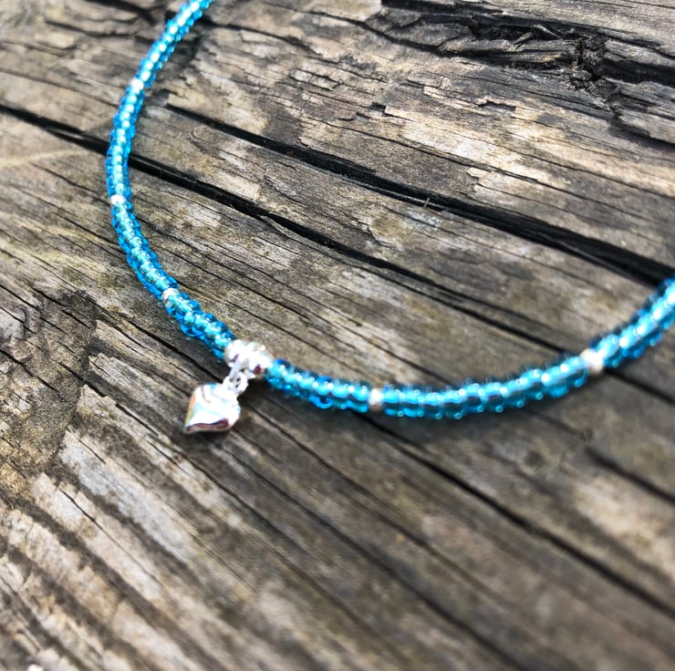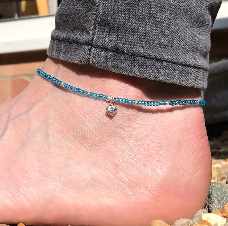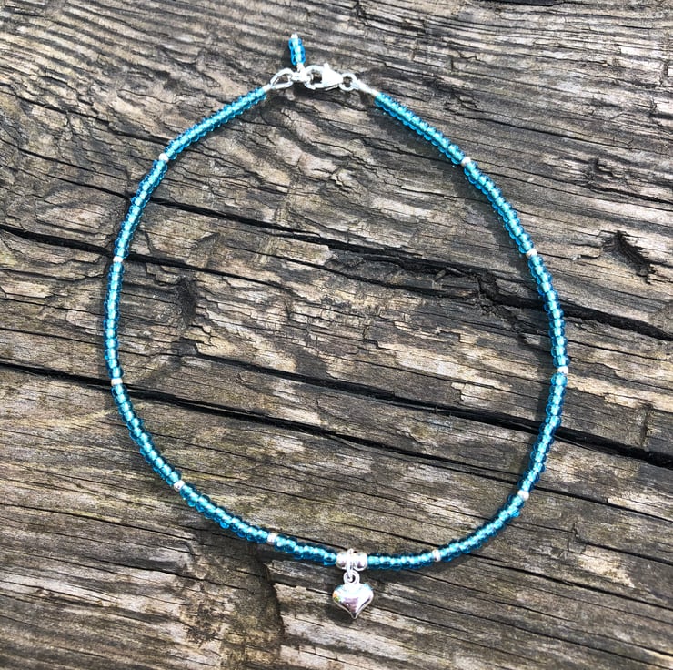 This ankle has been handmade using tiny glass seed beads, sterling silver beads and a sweet sterling silver puffed heart. All hand wired onto strong beading wire and fastened with a sterling silver lobster clasp.